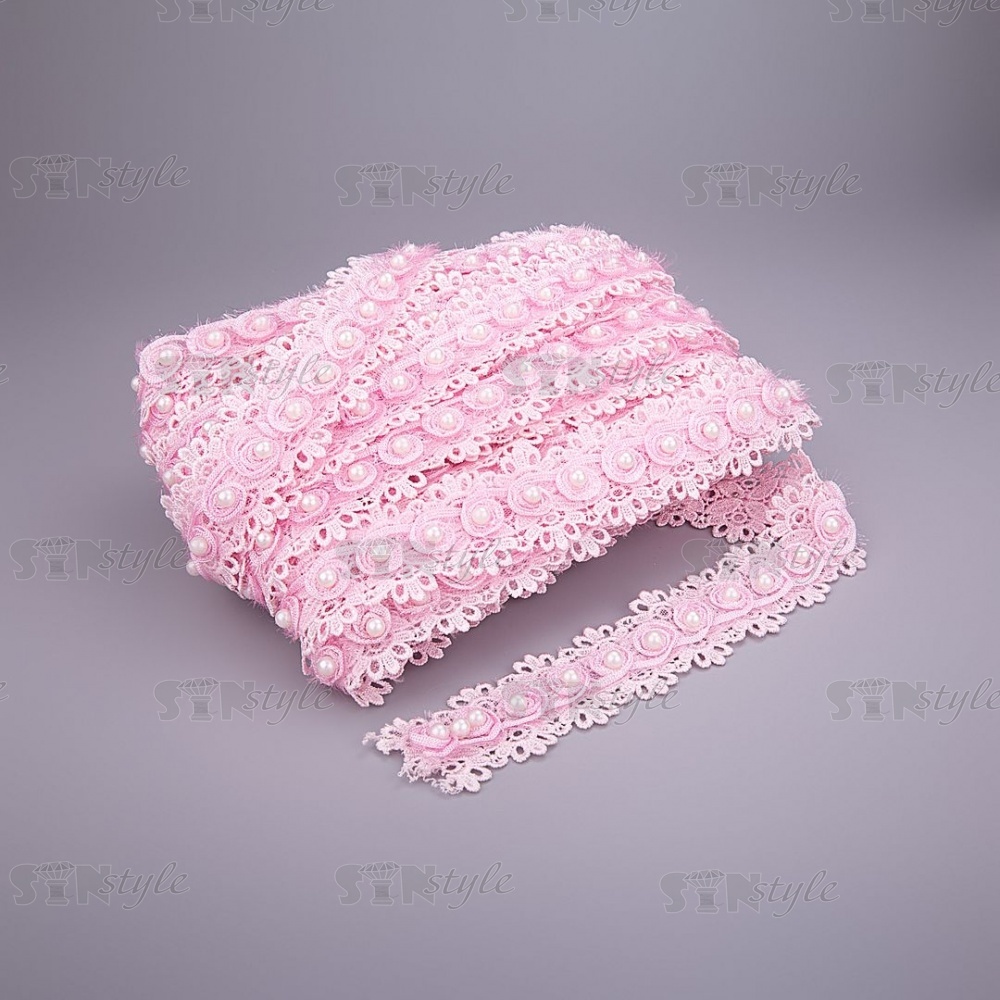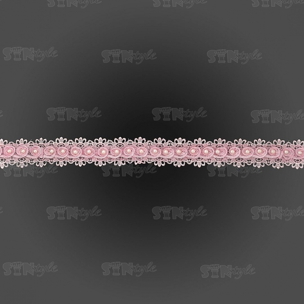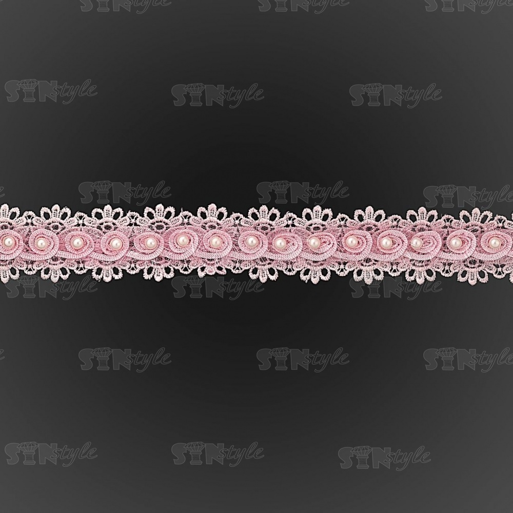 Кружево ажурное с отделкой, на нежной кружевной основе россыпь бутонов роз с бусиной в центре цветка, ширина 40 мм, намотка 15 ярдов, цвет розовый