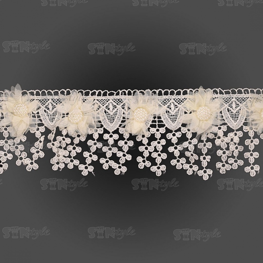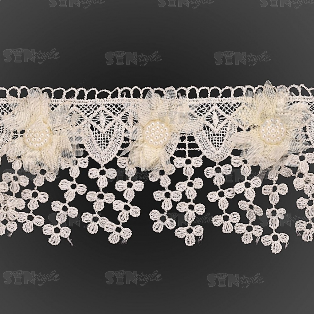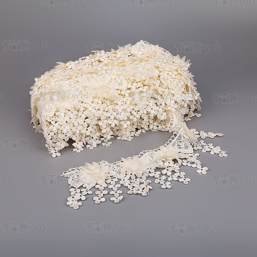 Кружево ажурное с отделкой, на нежной кружевной основе россыпь цветов из тонкого капрона, середина цветка состоит из мелких бусин, бахрома из мелких цветочков по краю изделия придает воздушность кружеву, ширина 80 мм, намотка 15 ярдов, цвет шампань