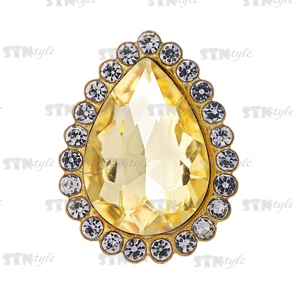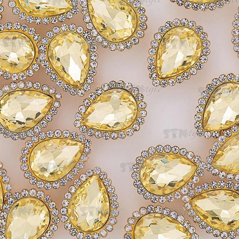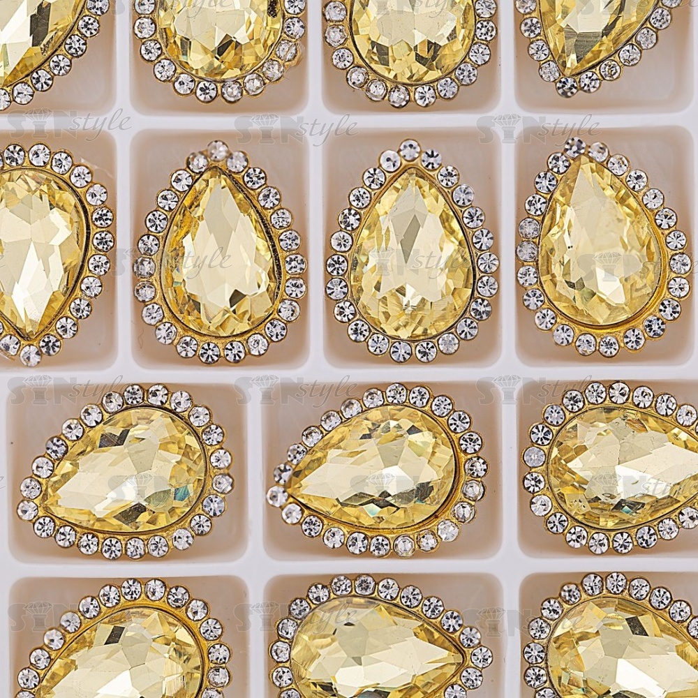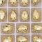 Стразы пришивные стеклянные в оправе, форма капля, цвет золото+желтый/белый, размер 10х14 мм