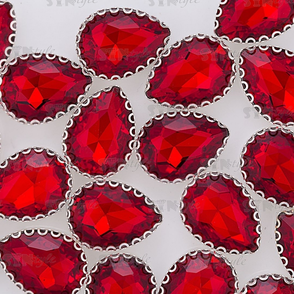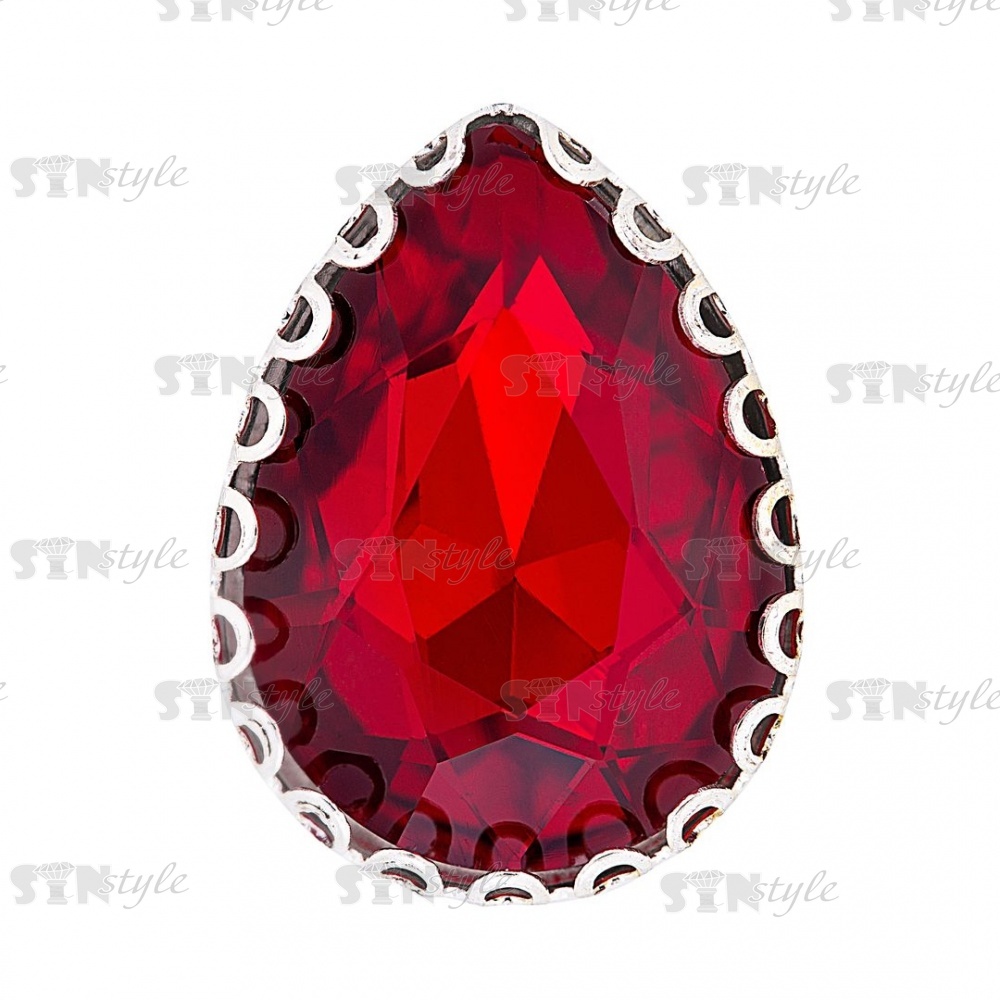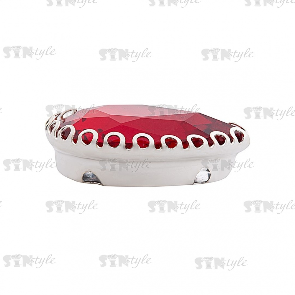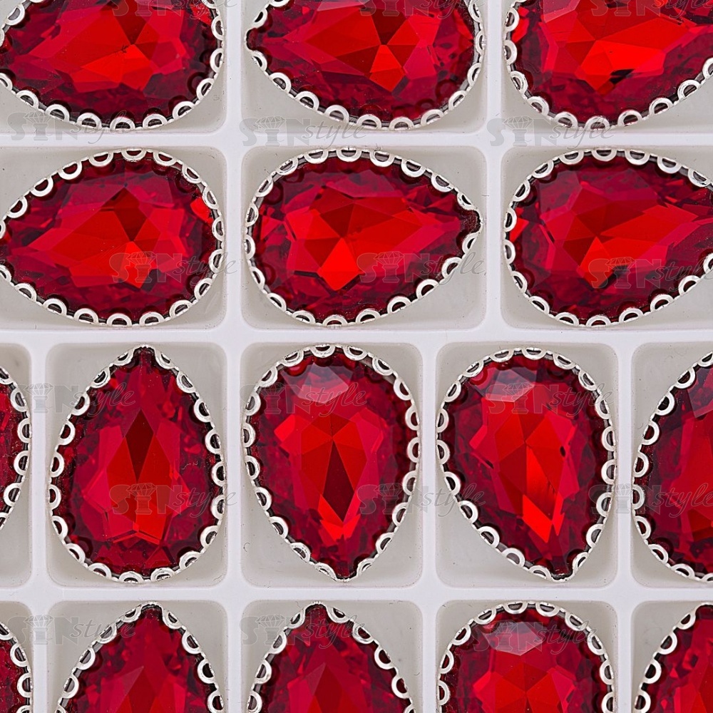 Стразы пришивные, стеклянные в оправе, форма капля, цвет серебро+красный, размер 13х18 мм