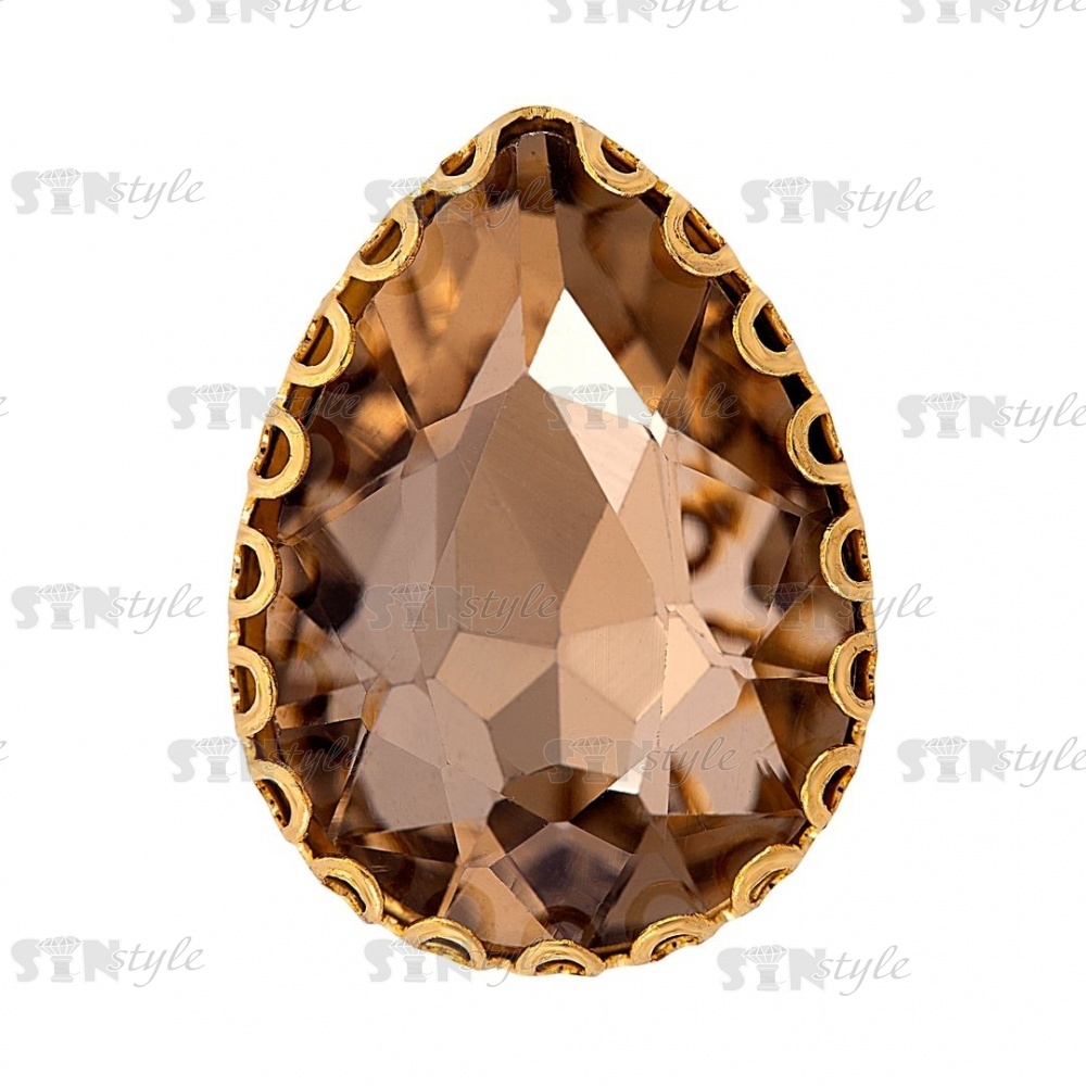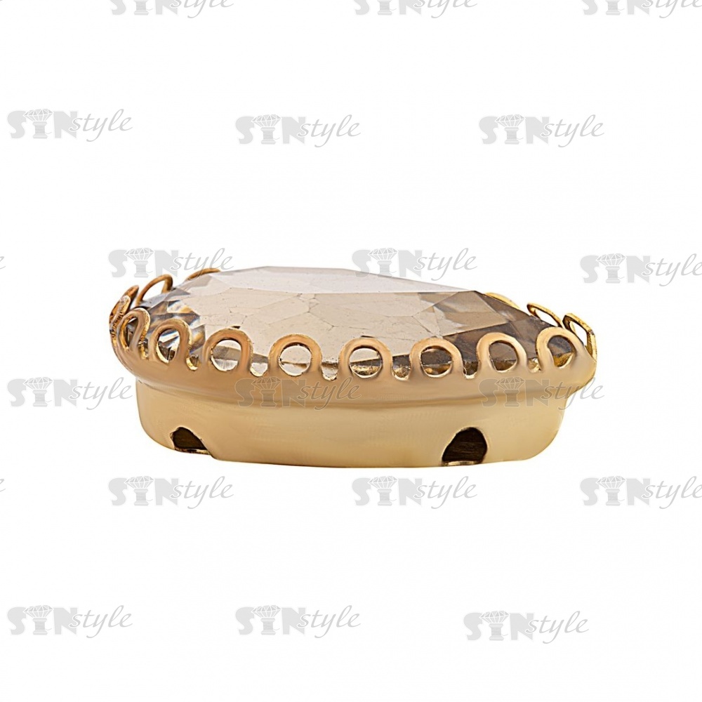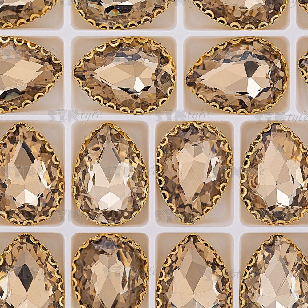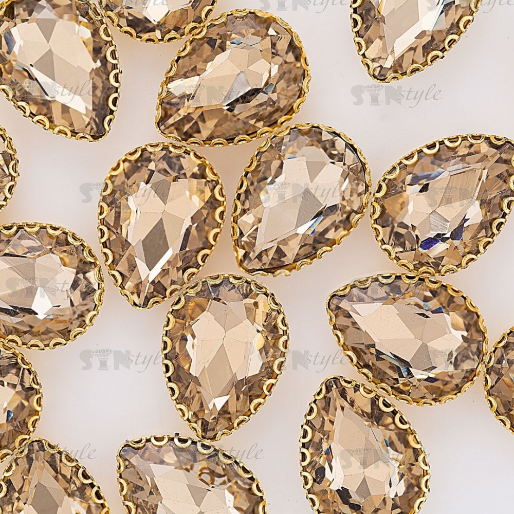 Стразы пришивные, стеклянные в оправе, форма капля, цвет золото+шампань, размер 13х18 мм