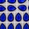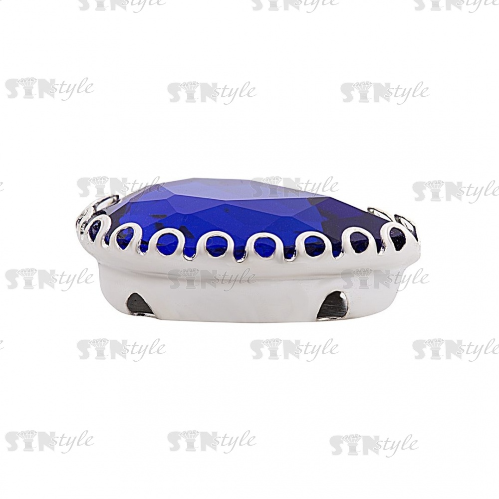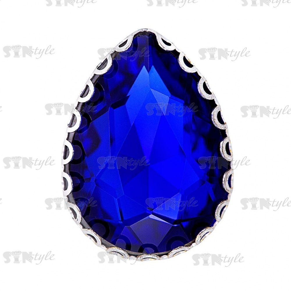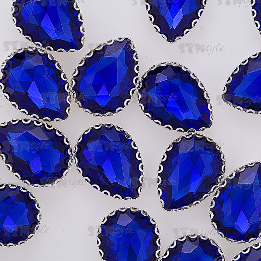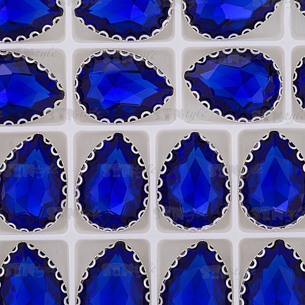 Стразы пришивные, стеклянные в оправе, форма капля, цвет серебро+синий, размер 13х18 мм