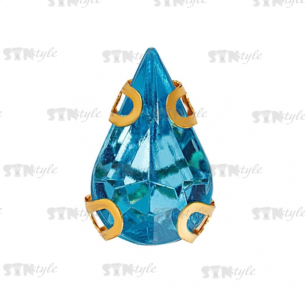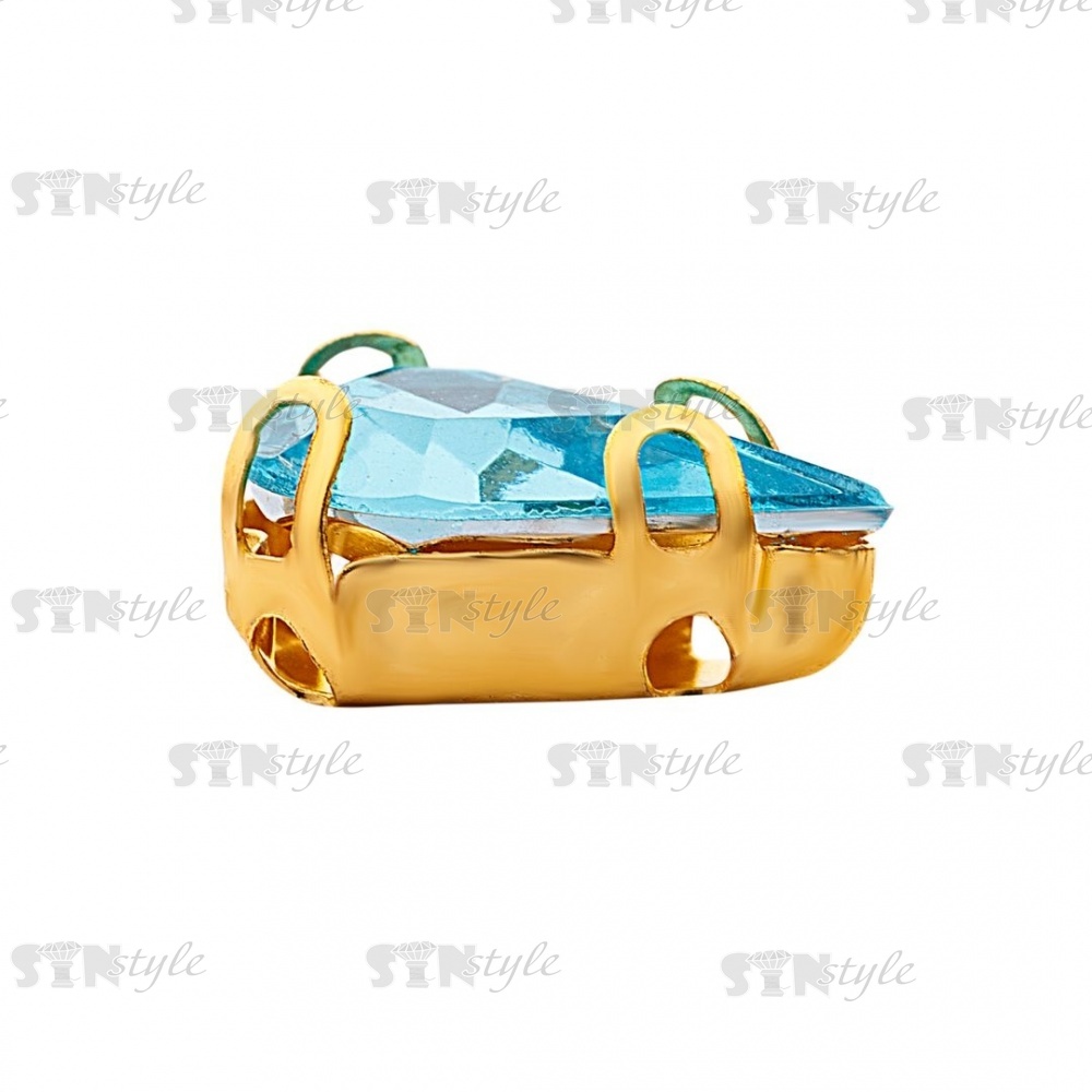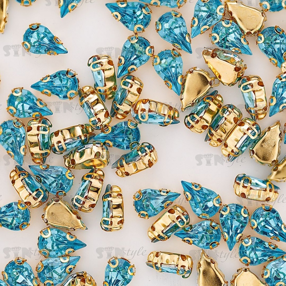Стразы пришивные акриловые в цапах, форма капля, цвет золото+голубой, размер 6х10мм, 200 шт/уп.