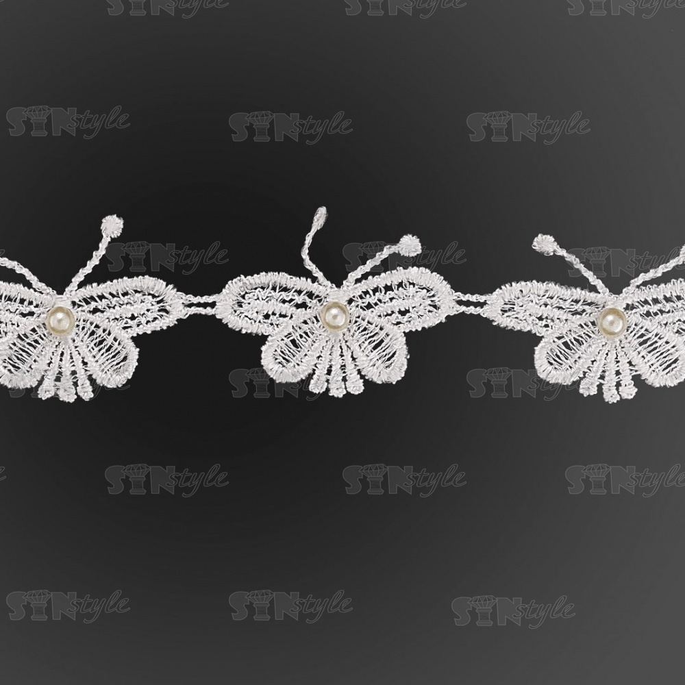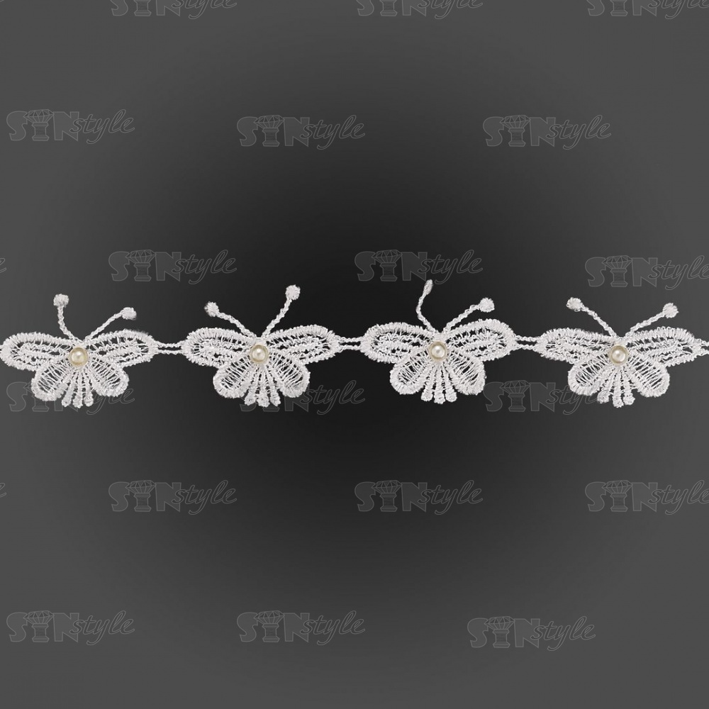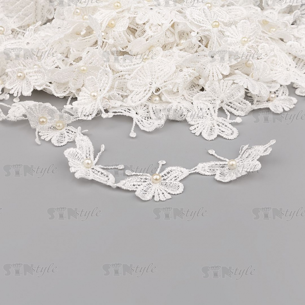 Кружево "Бабочка", нежная гирлянда из ажурных бабочек с бусиной в середине, ширина 45 мм, намотка 15 ярдов, цвет белый