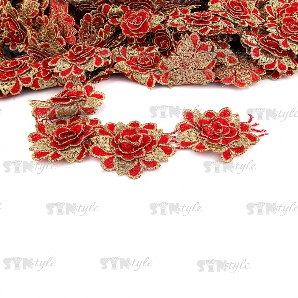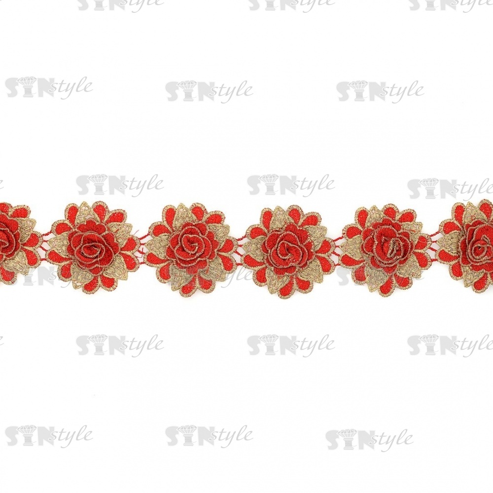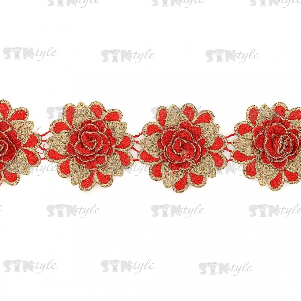 Нарядное кружево с объемными цветами, ширина на 80 мм, цвет красный с золотым люрексом, намотка 15 ярдов