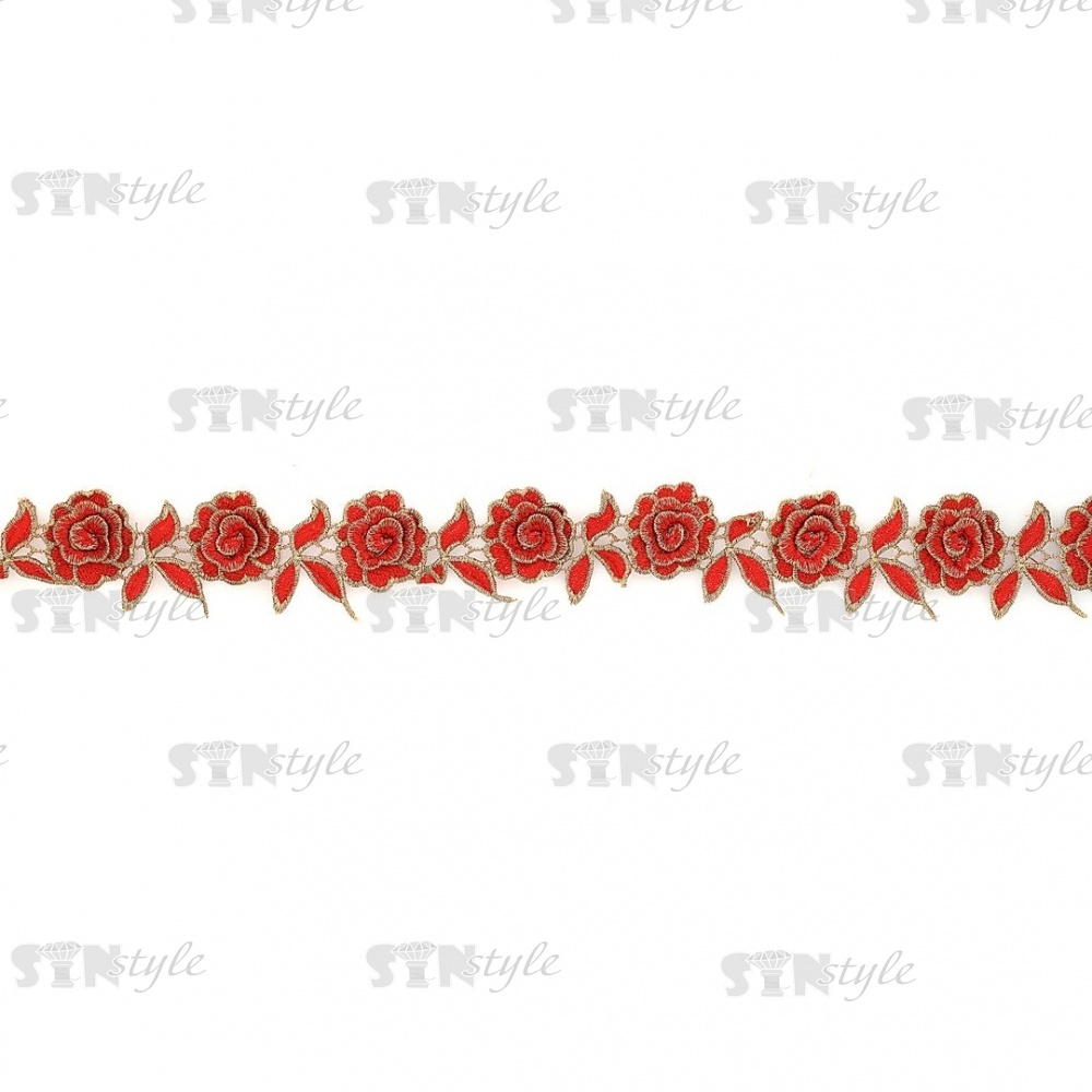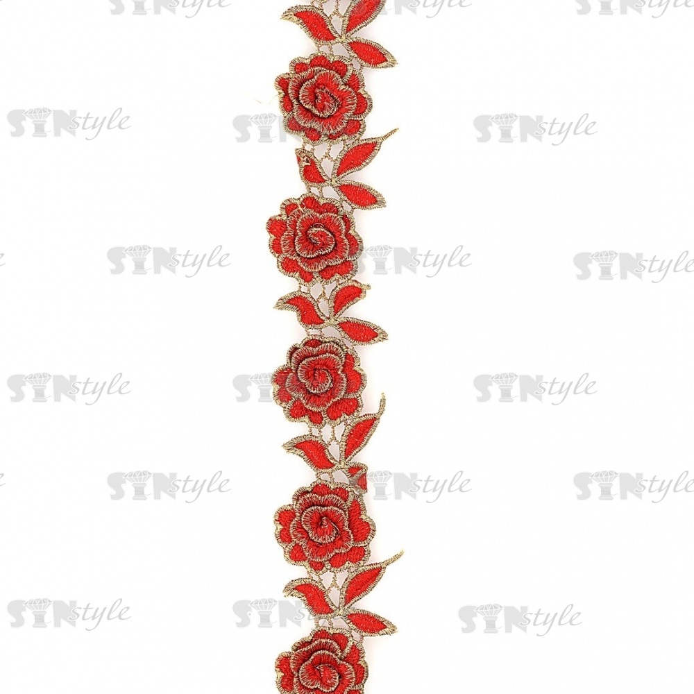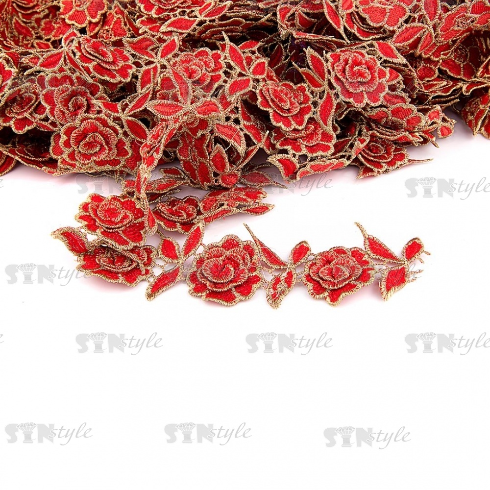 Нарядное кружево с объемными цветами, ширина 50 мм, цвет красный с золотым люрексом, намотка 15 ярдов
