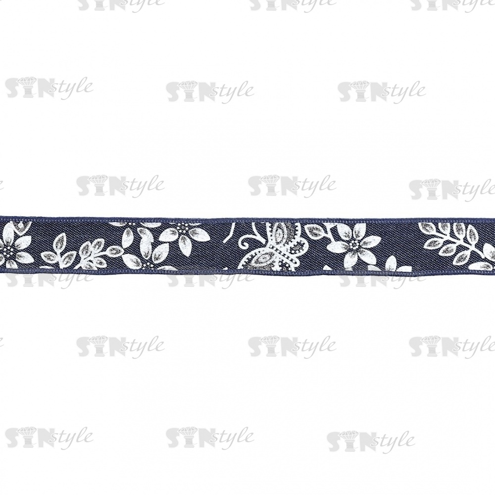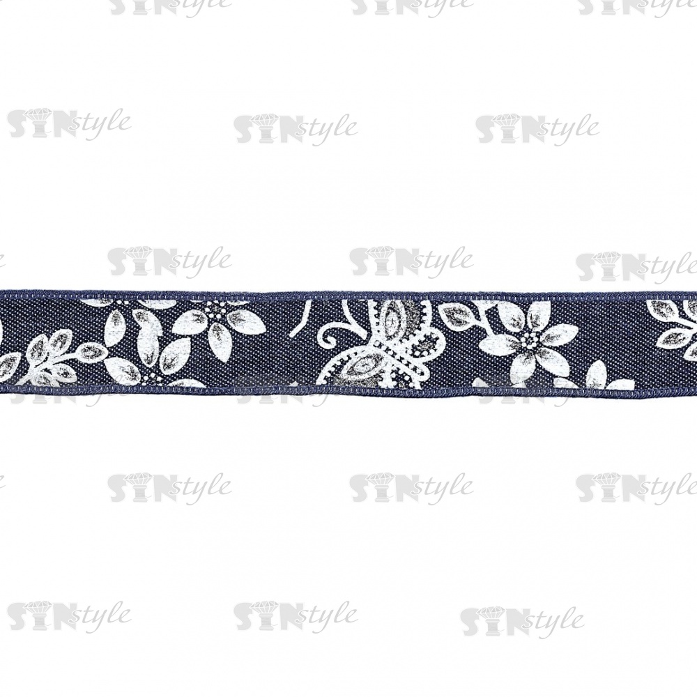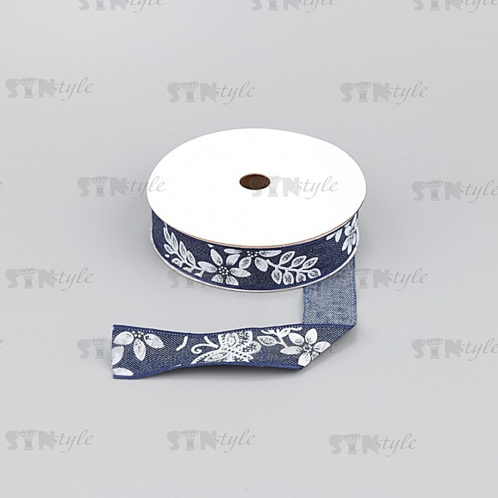 Джинсовая лента с цветочным принтом белого цвета, ширина 25 мм, намотка 20 ярдов