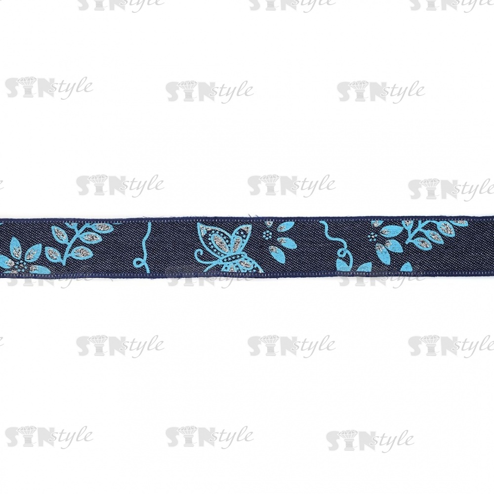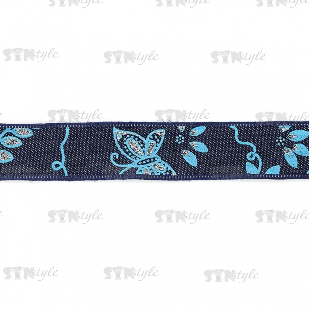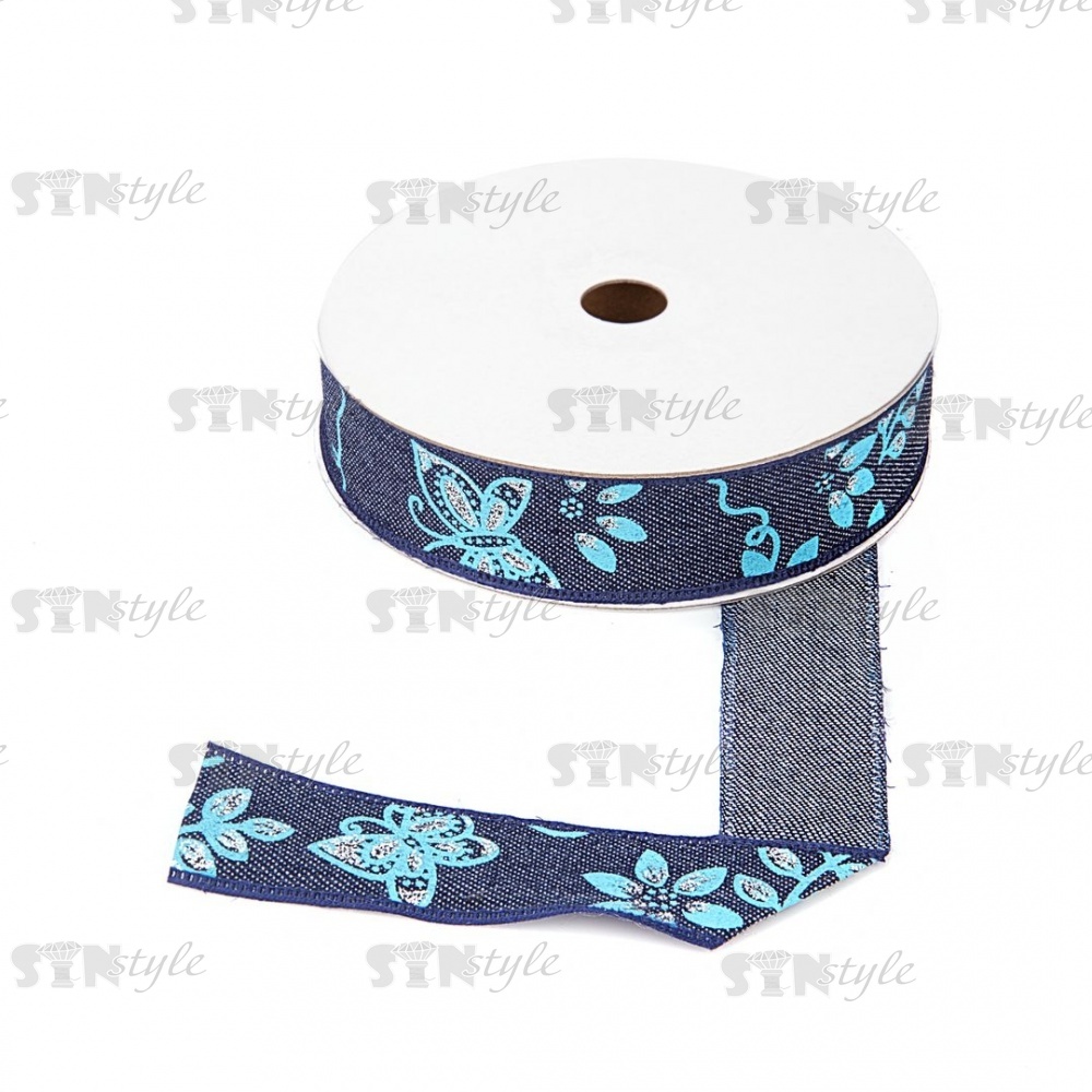 Джинсовая лента с цветочным принтом голубого цвета, ширина 25 мм, намотка 20 ярдов