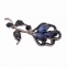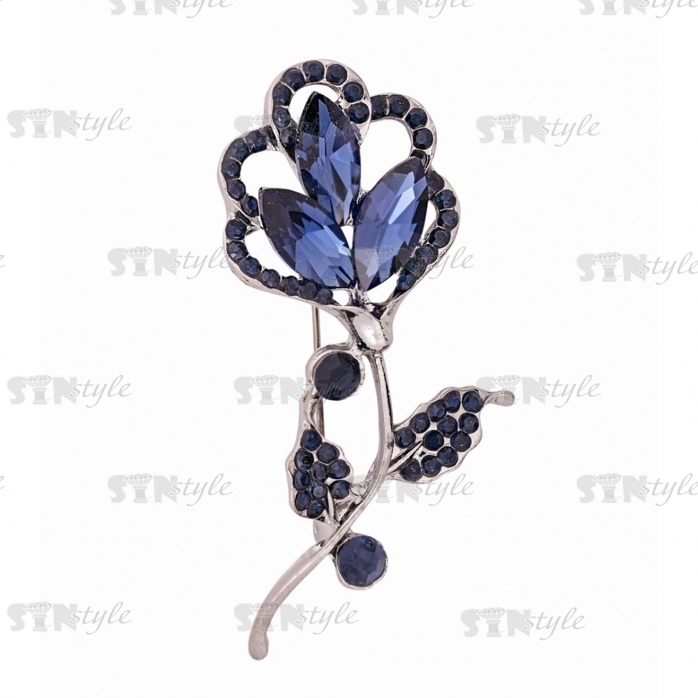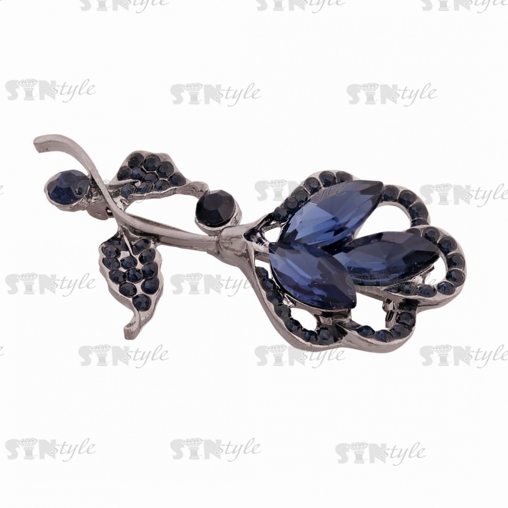 Брошь металлическая со стразами, цвет темный никель+синие стразы,застежка булавка, размер 32х64 мм