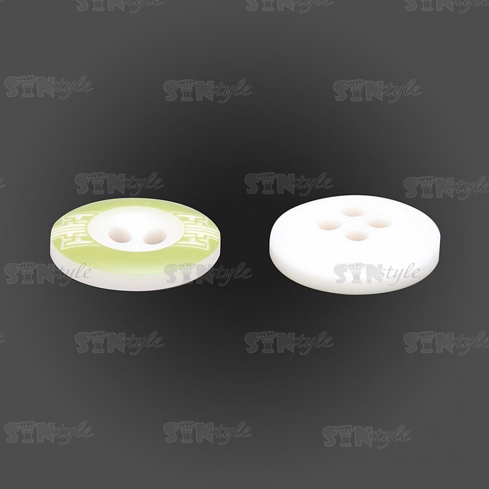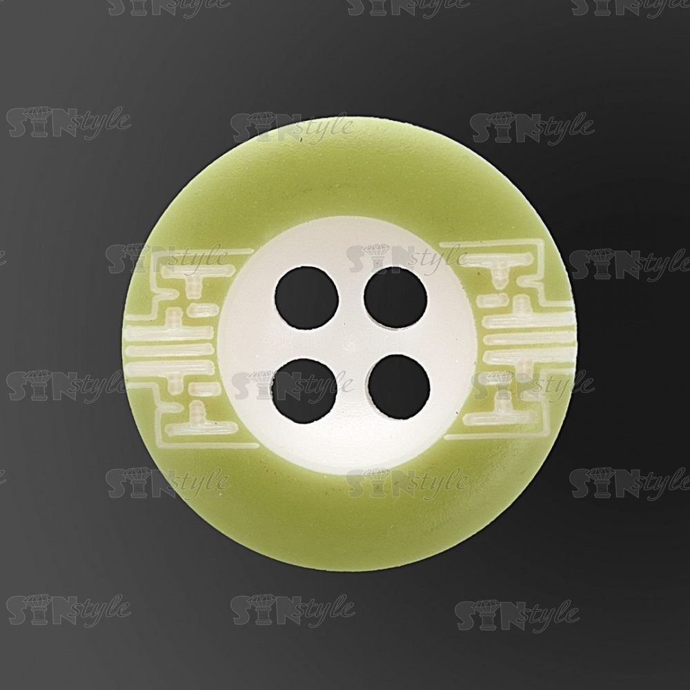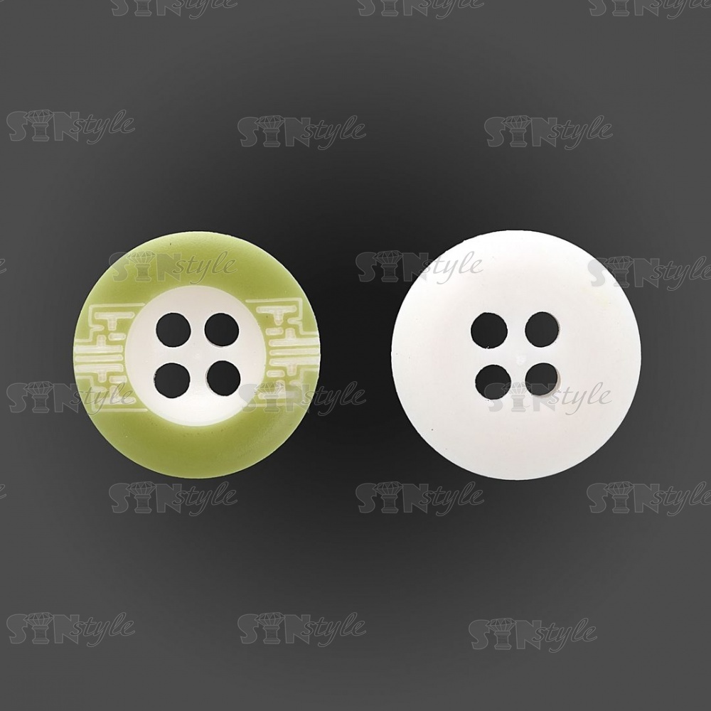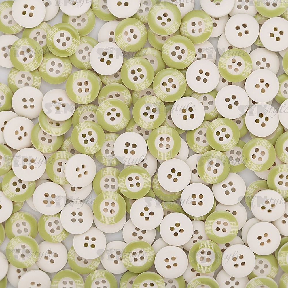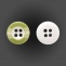 Пуговица пластиковая на четыре прокола, размер 24L, цвет белый с салатовым