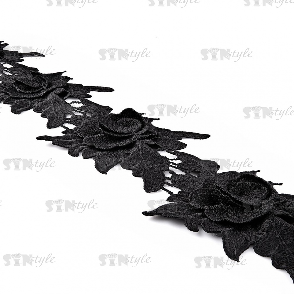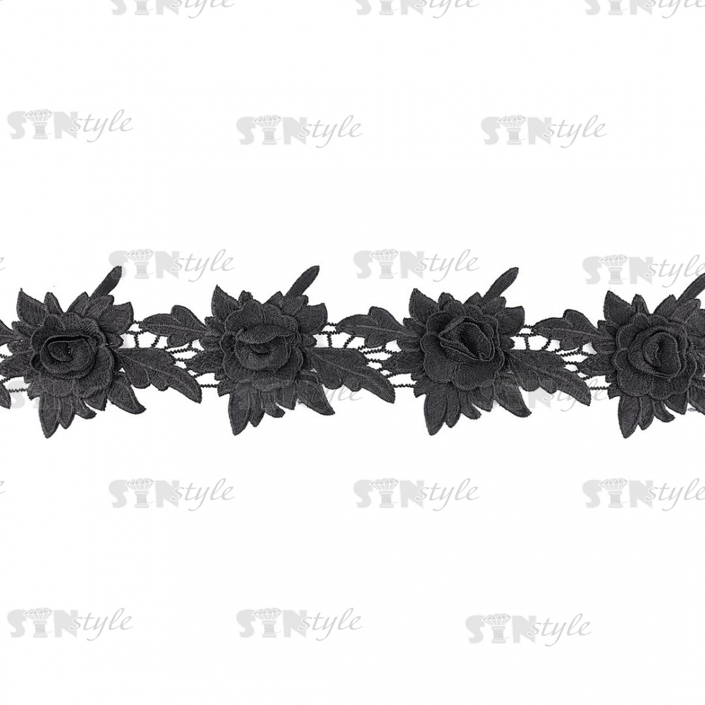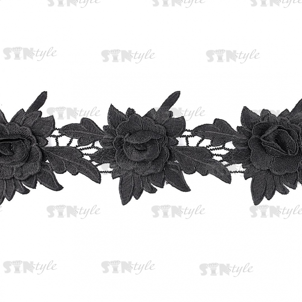 Кружево "Цветочное", красивая цветочная гирлянда из объемных цветов и резных листьев ширина 90 мм, цвет черный, намотка 15 ярдов