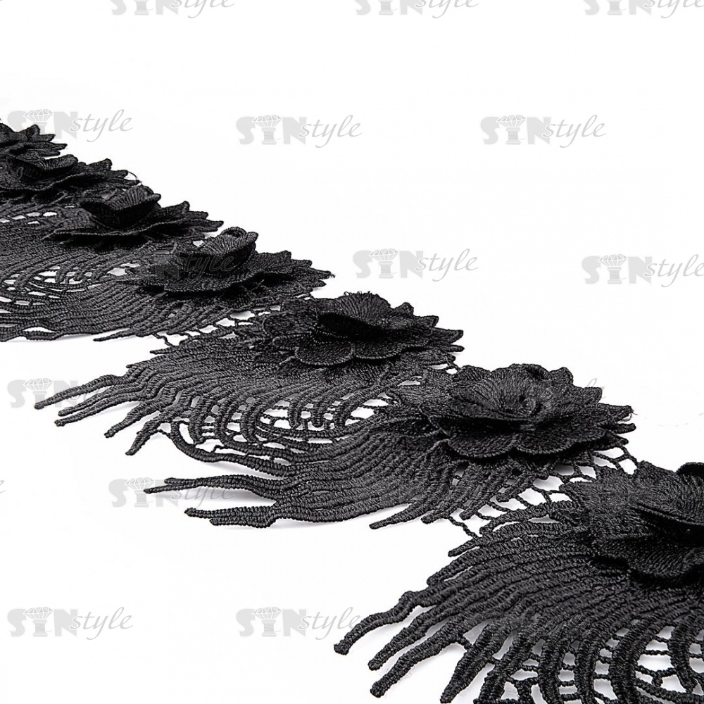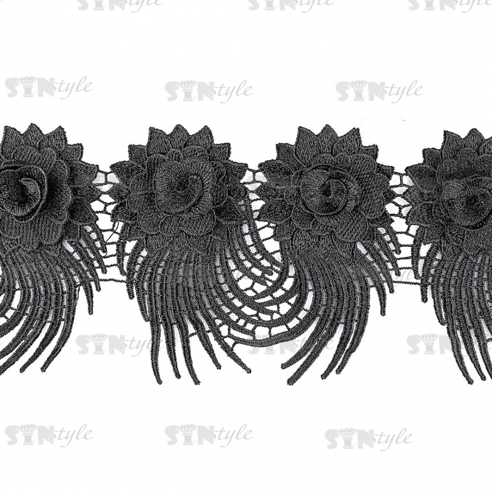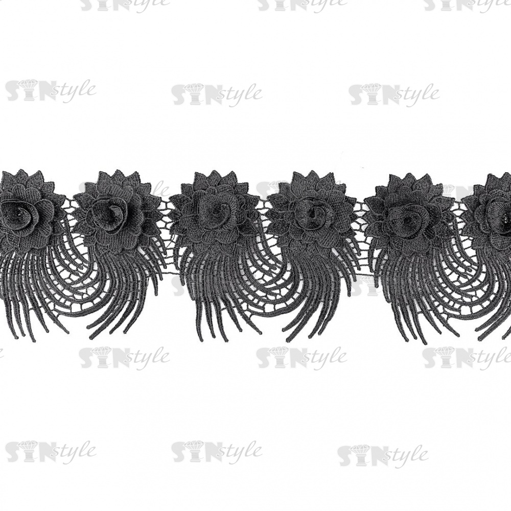 Кружево "Цветочное", красивая цветочная гирлянда из объемных цветов и длинным резным краем, ширина 130 мм, цвет черный, намотка 15 ярдов