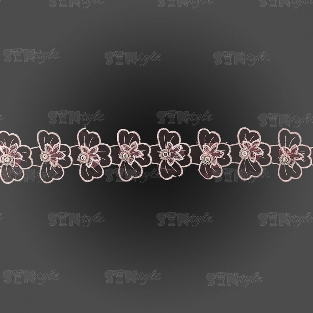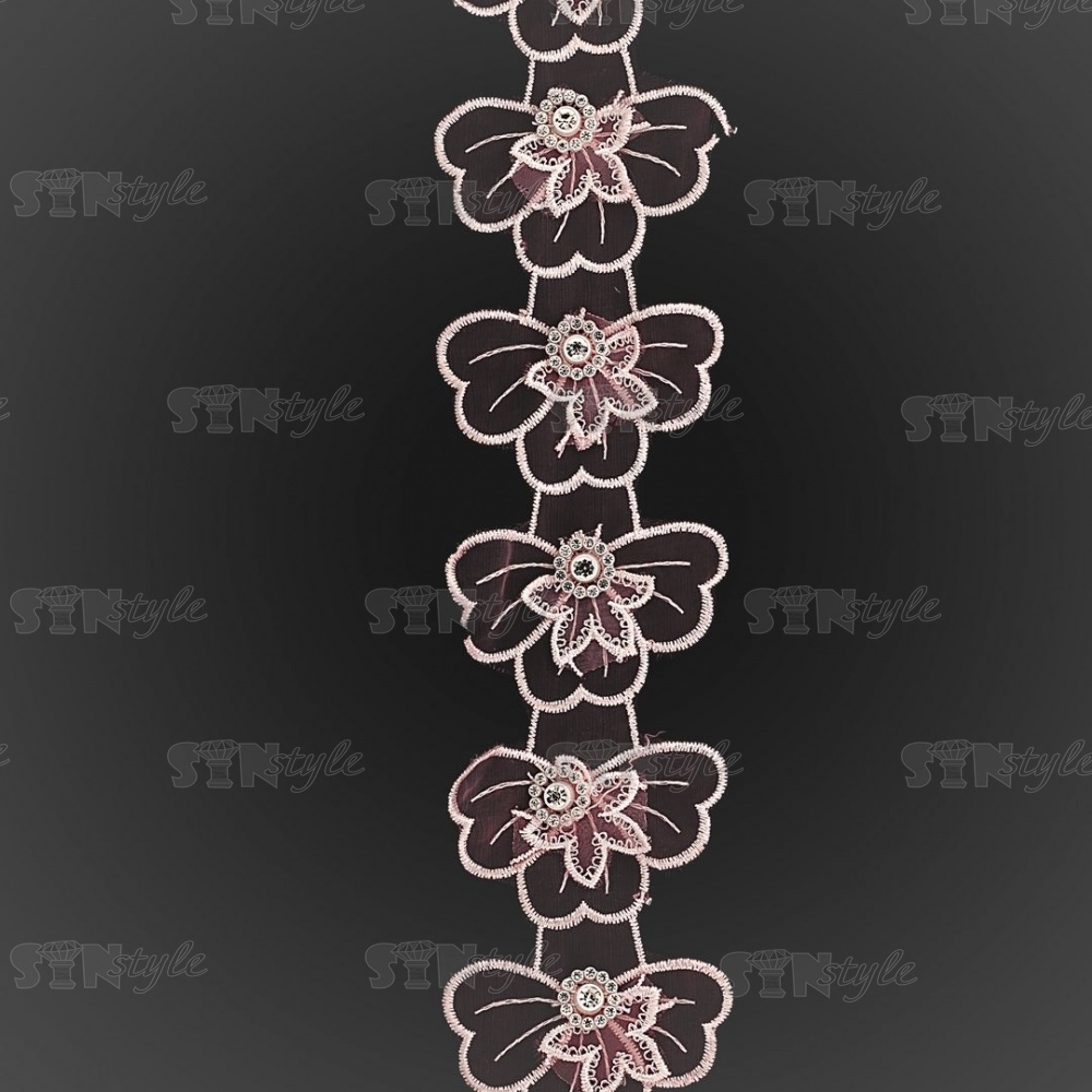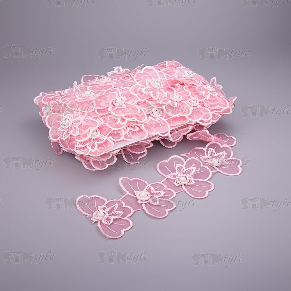 Кружево "Бантики" на капроновой ленте со стразами, ширина 65 мм, цвет розовый, намотка 15 ярдов