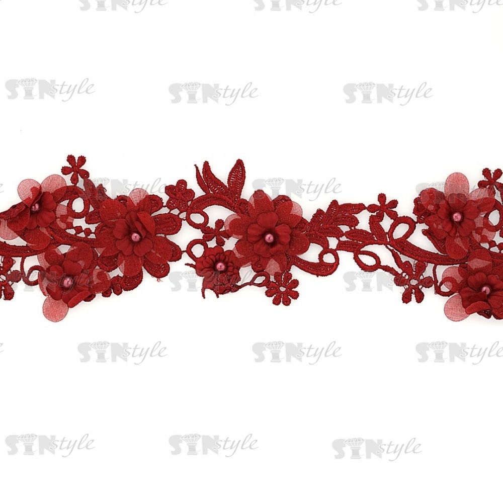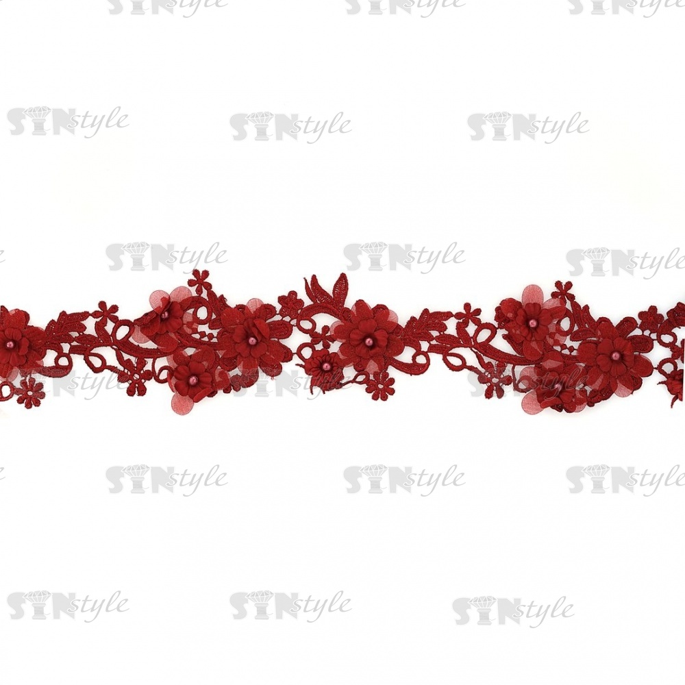 Кружево "Цветочное", воздушная цветочная гирлянда с бусиной в середине каждого цветка, ширина 85 мм, намотка 10 ярдов, цвет бордовый