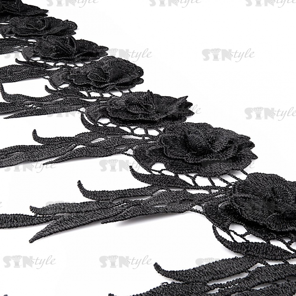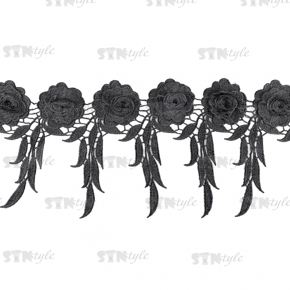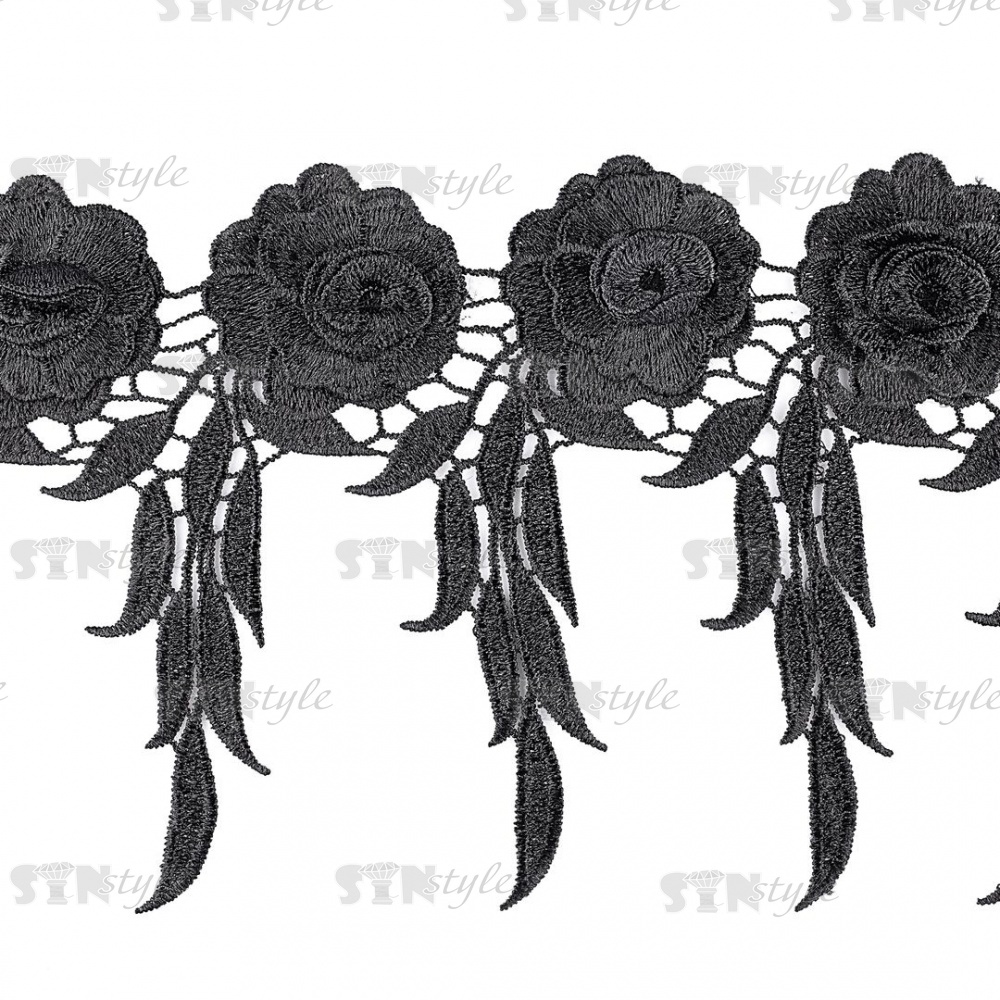 Кружево "Цветочное", нежная цветочная гирлянда из объемных бутонов роз и бахромой с резными листьями по нижнему краю, ширина 180 мм, цвет черный, намотка 15 ярдов