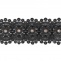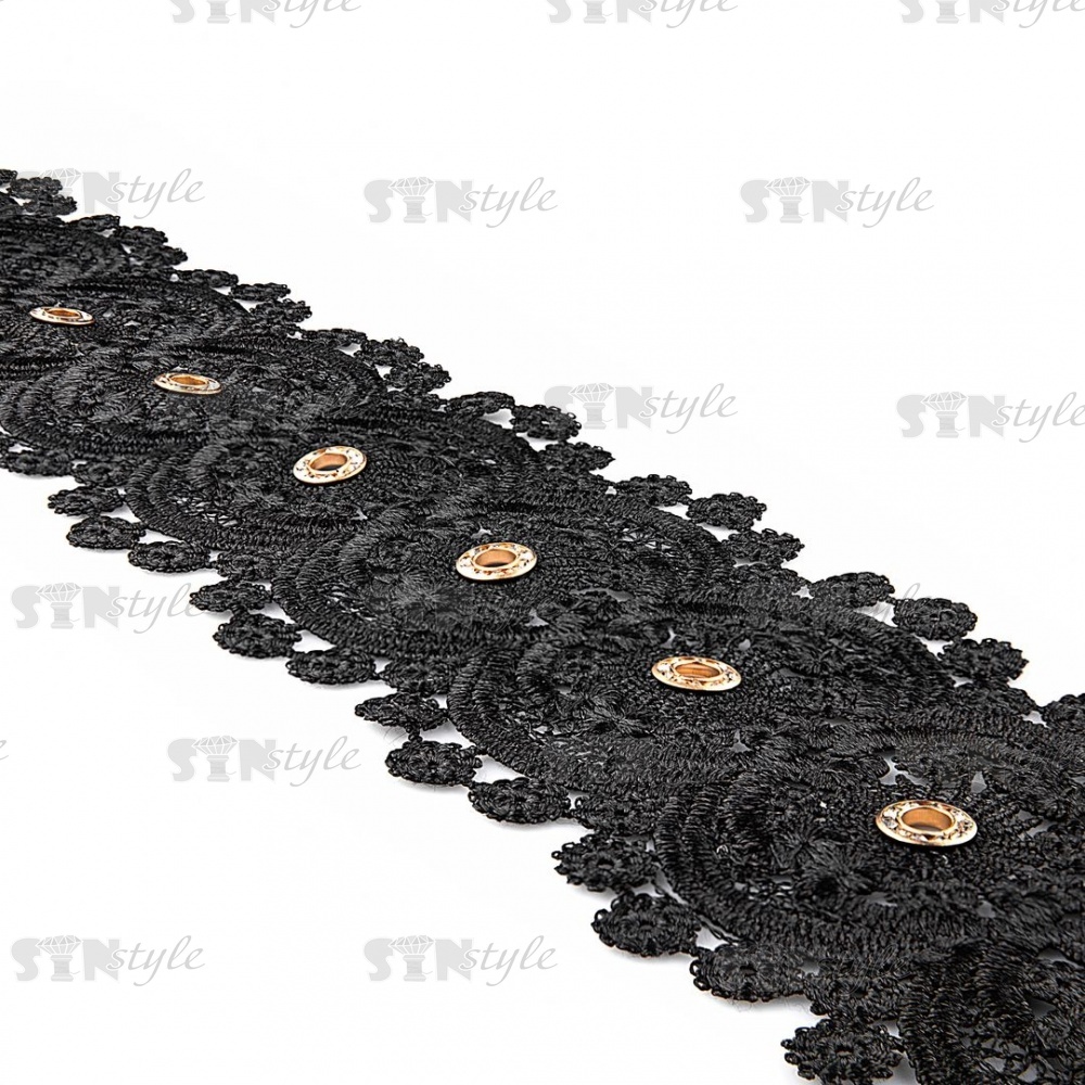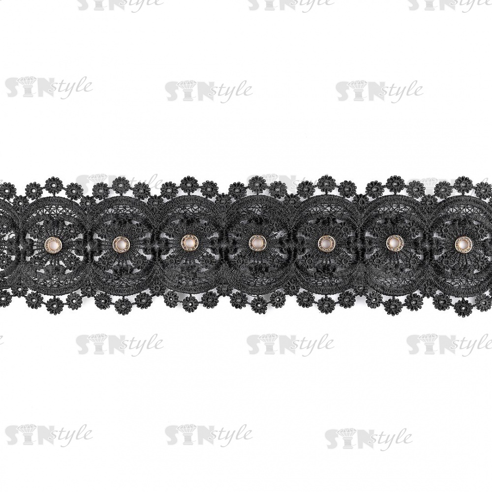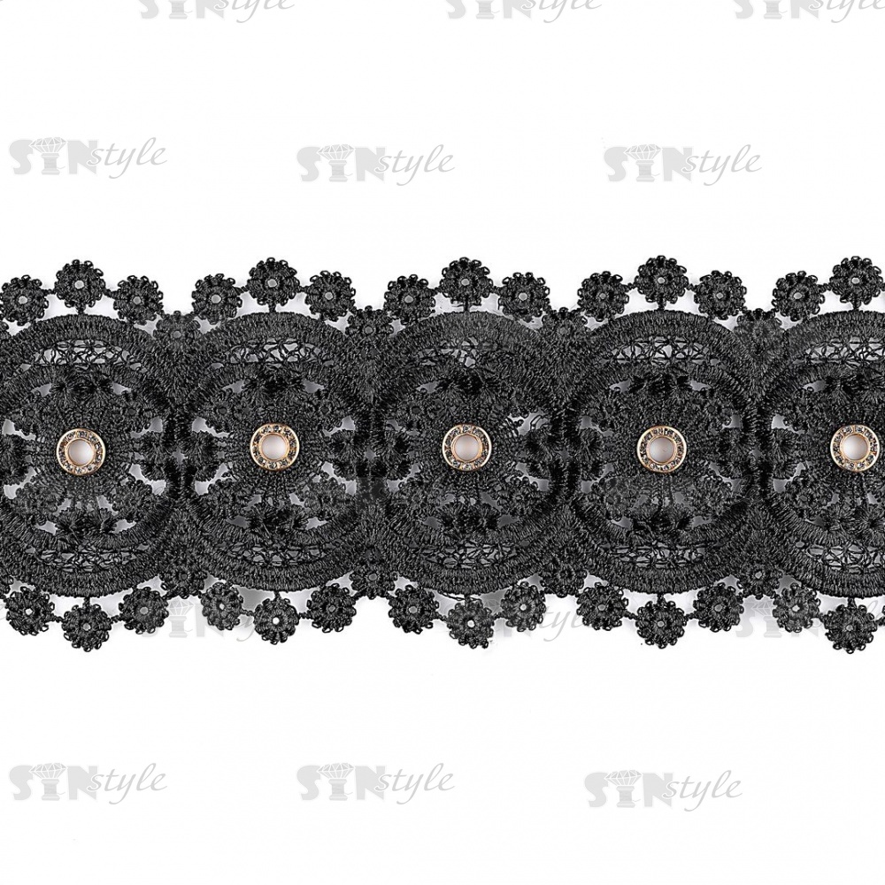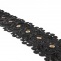 Кружево ажурное с цветочным орнаментом, украшенное золотыми люверсами и белыми стразами, ширина 95 мм, намотка 15 ярдов, цвет черный
