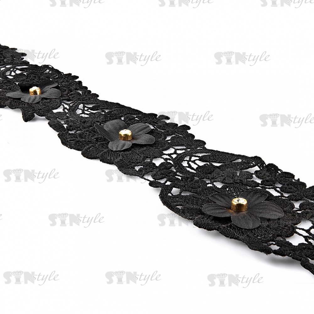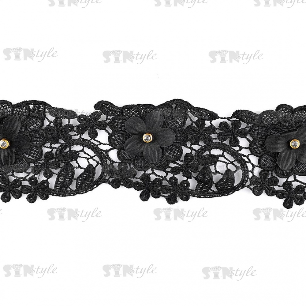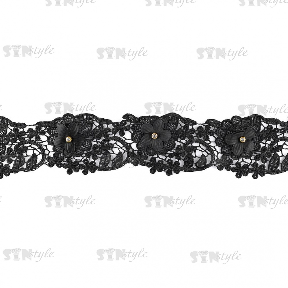 Кружево ажурное с отделкой, на тонкой ажурной основе цветочная гирлянда стразой в центре каждого цветка, ширина 90 мм, намотка 10 ярдов, цвет черный