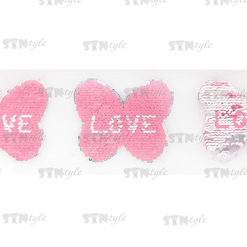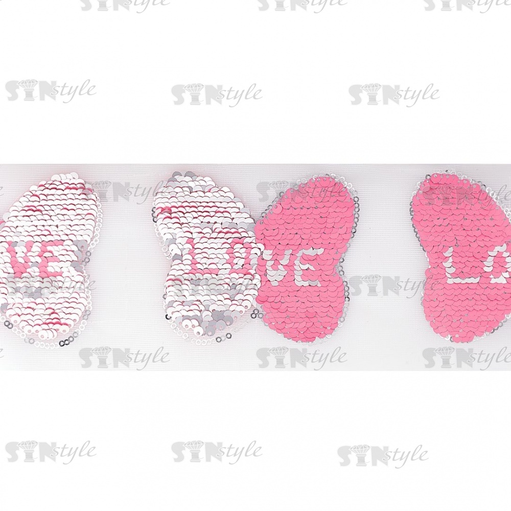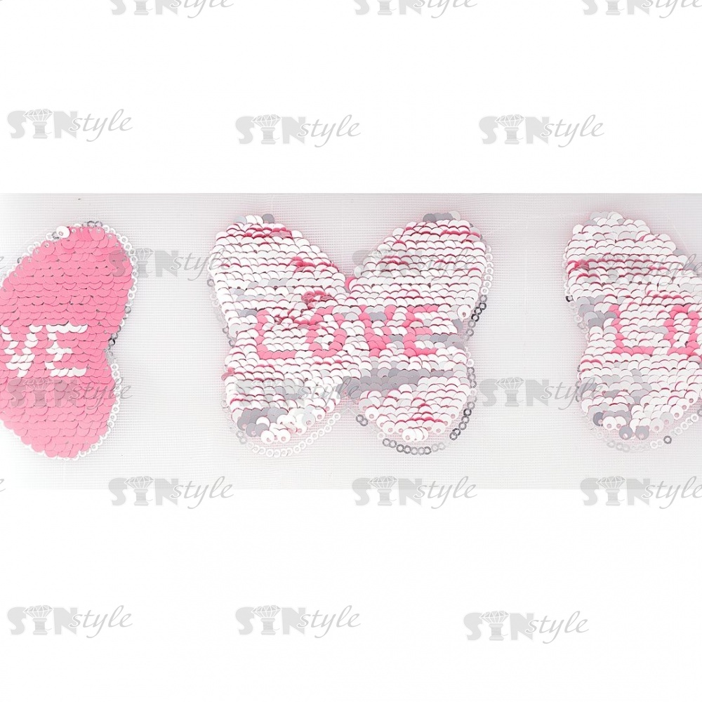 Аппликация на сетке из пайеток "Бабочка", размер 85 х 80 мм,цвет розовый+серебряный, рулон 82 шт.