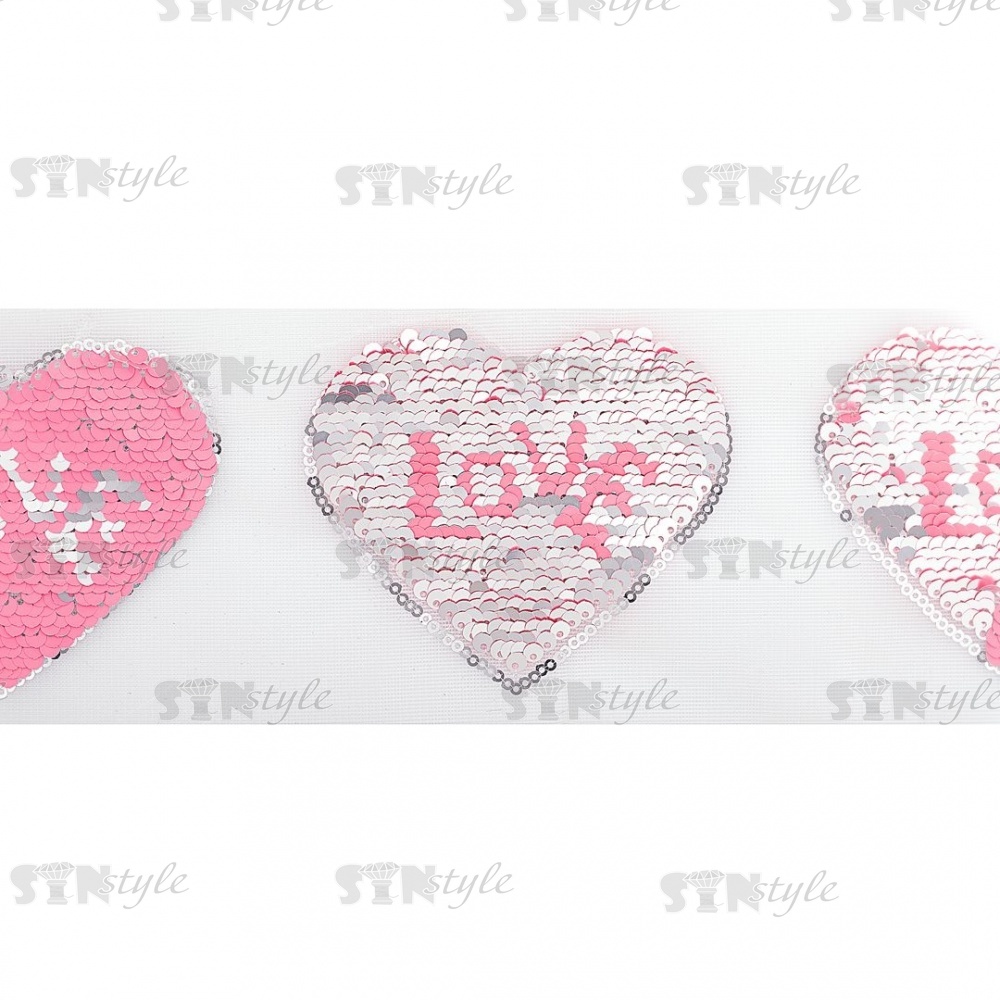 Аппликация на сетке из пайеток "Сердце", размер 100 х 80 мм, цвет розовый+серебряный, рулон 82 шт.
