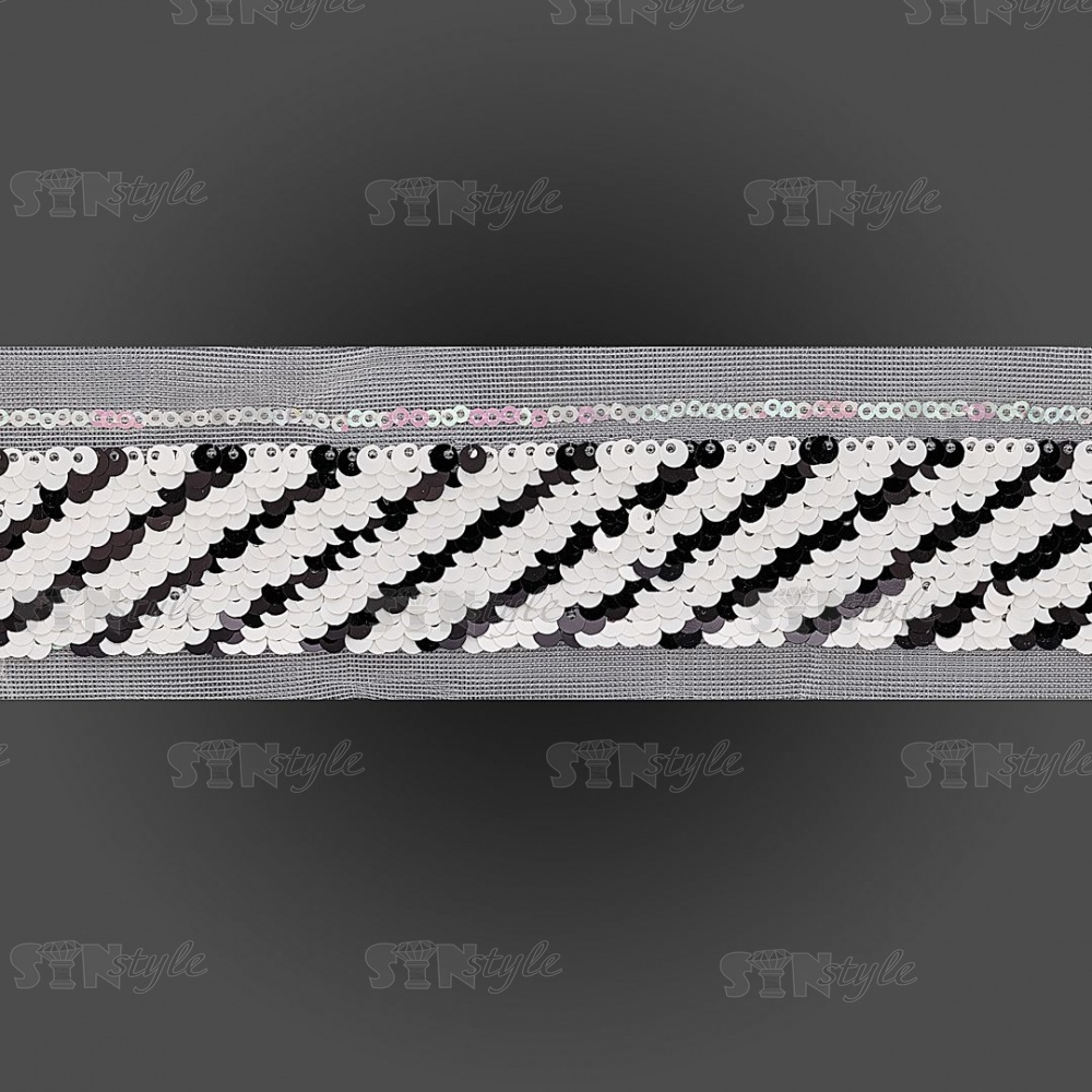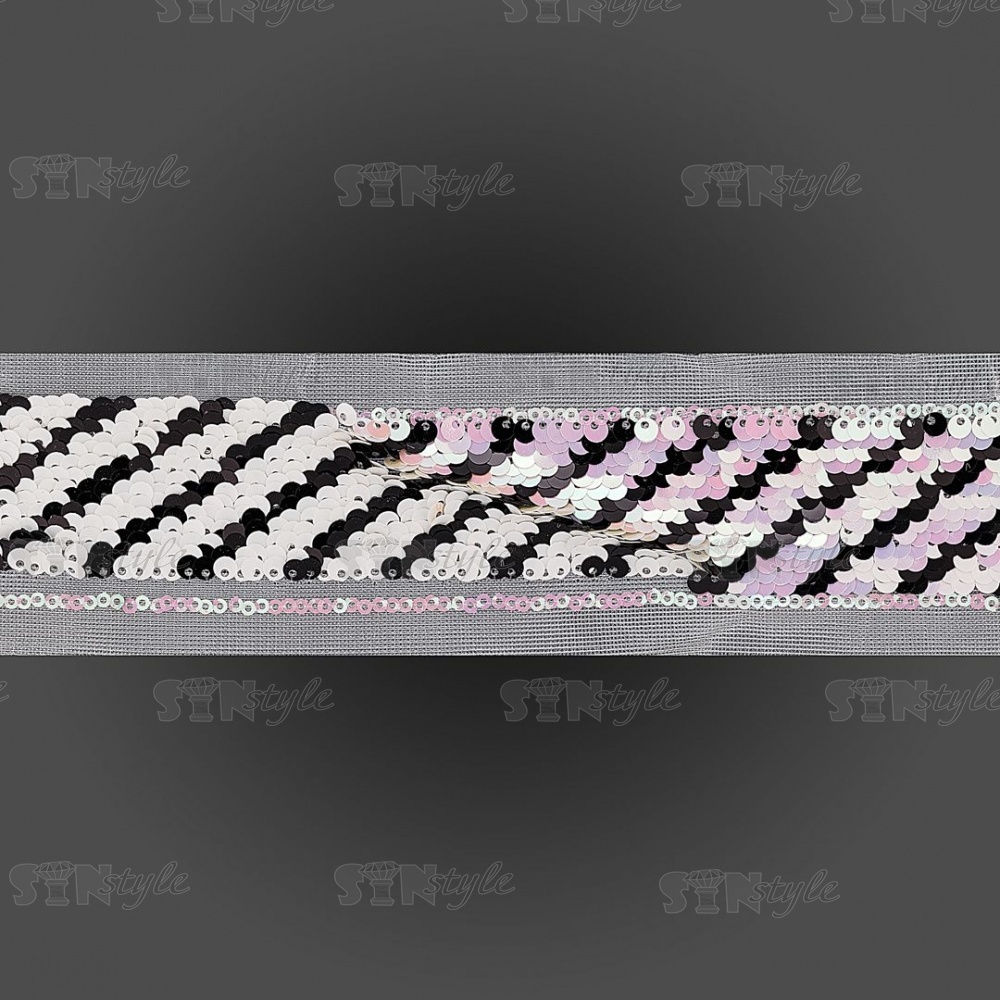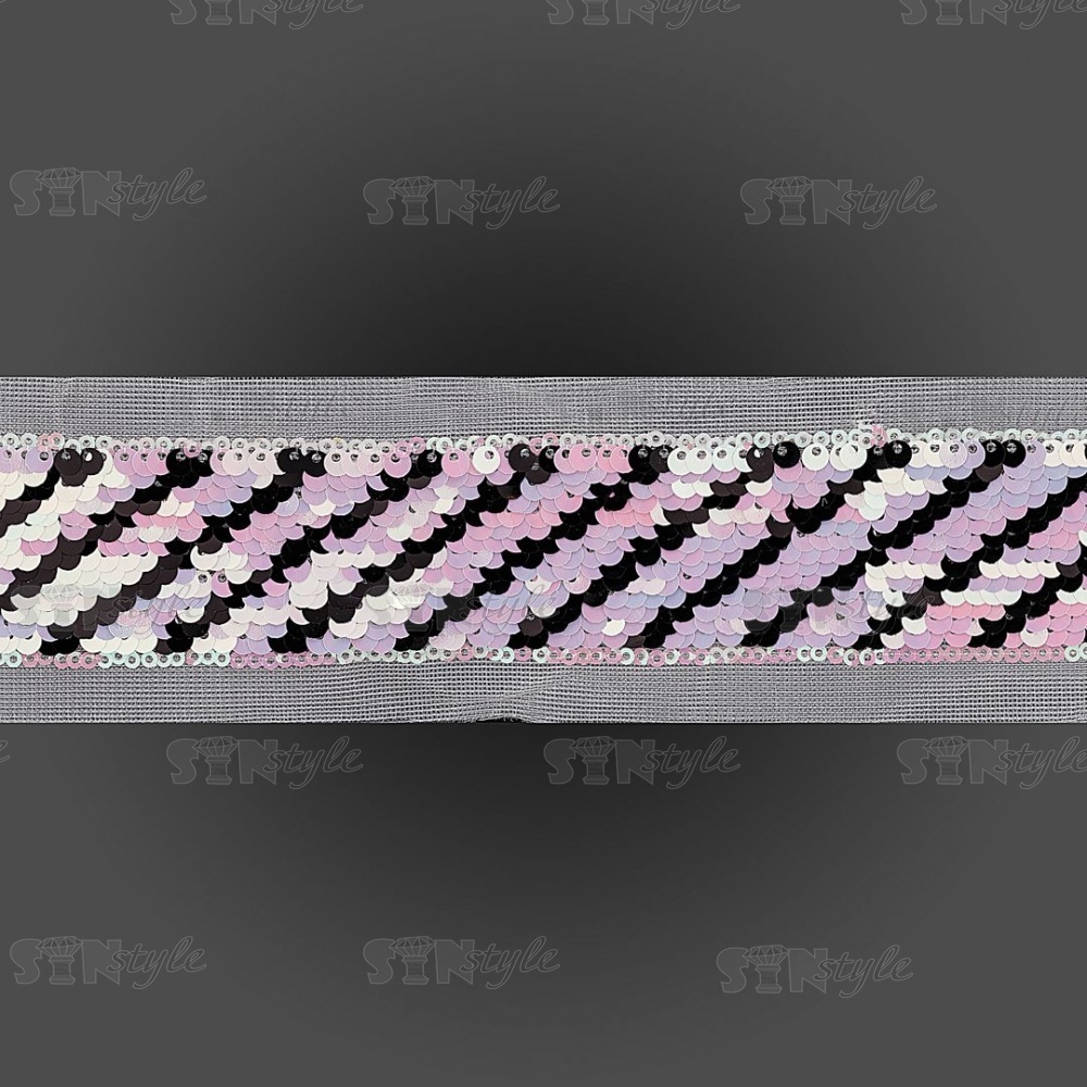 Тесьма на сетке, расшитая пайетками, ширина 42 мм, цвет розовый+черный, рулон 14 ярдов