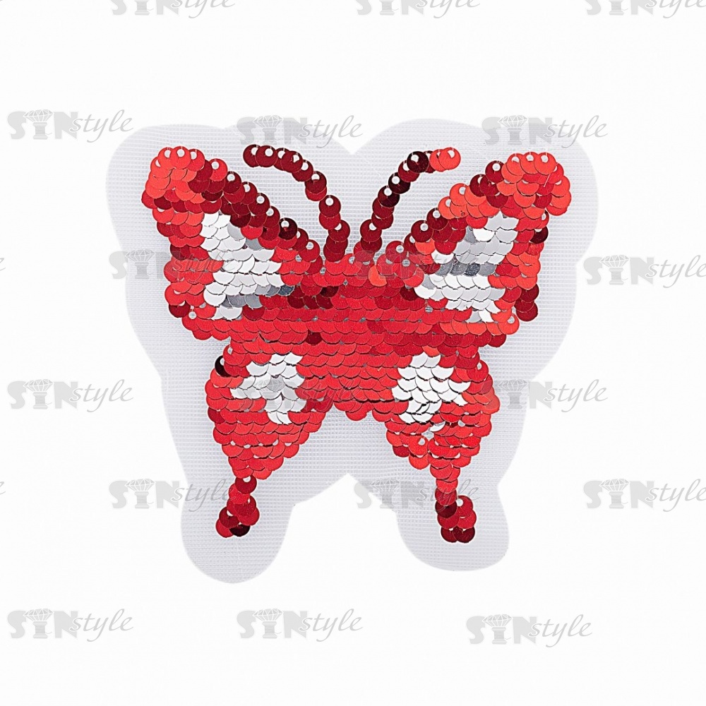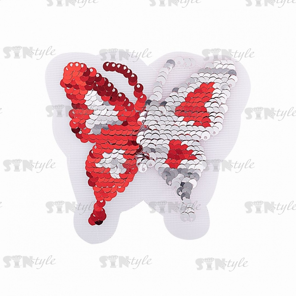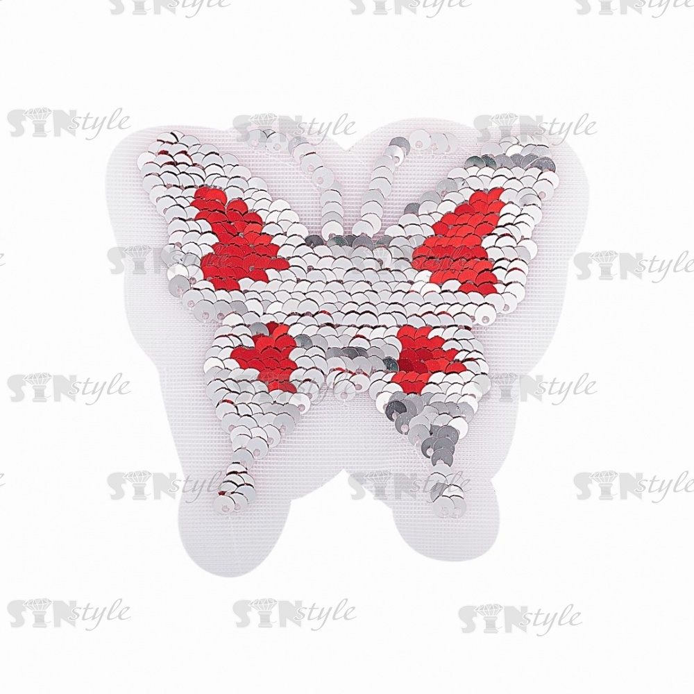 Аппликация на сетке из пайеток "Бабочка", размер 90 х 85 мм, цвет красный+серебряный, рулон 82 шт.