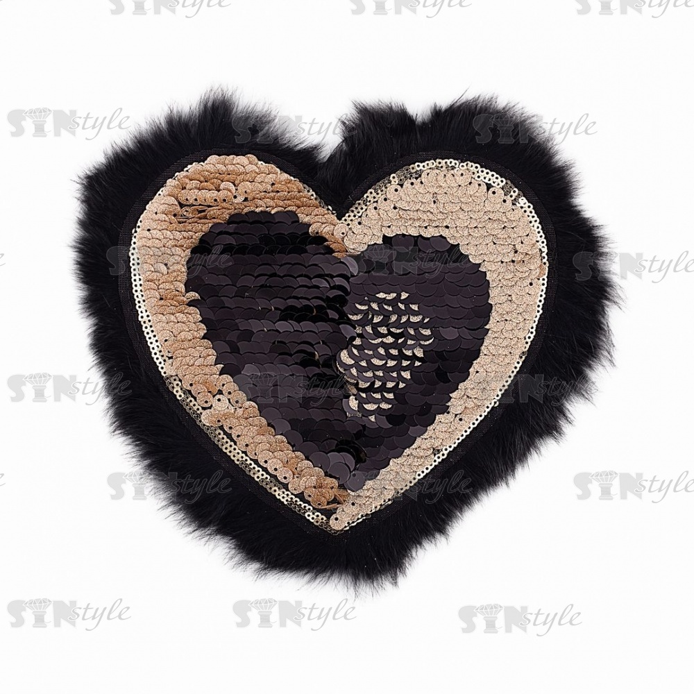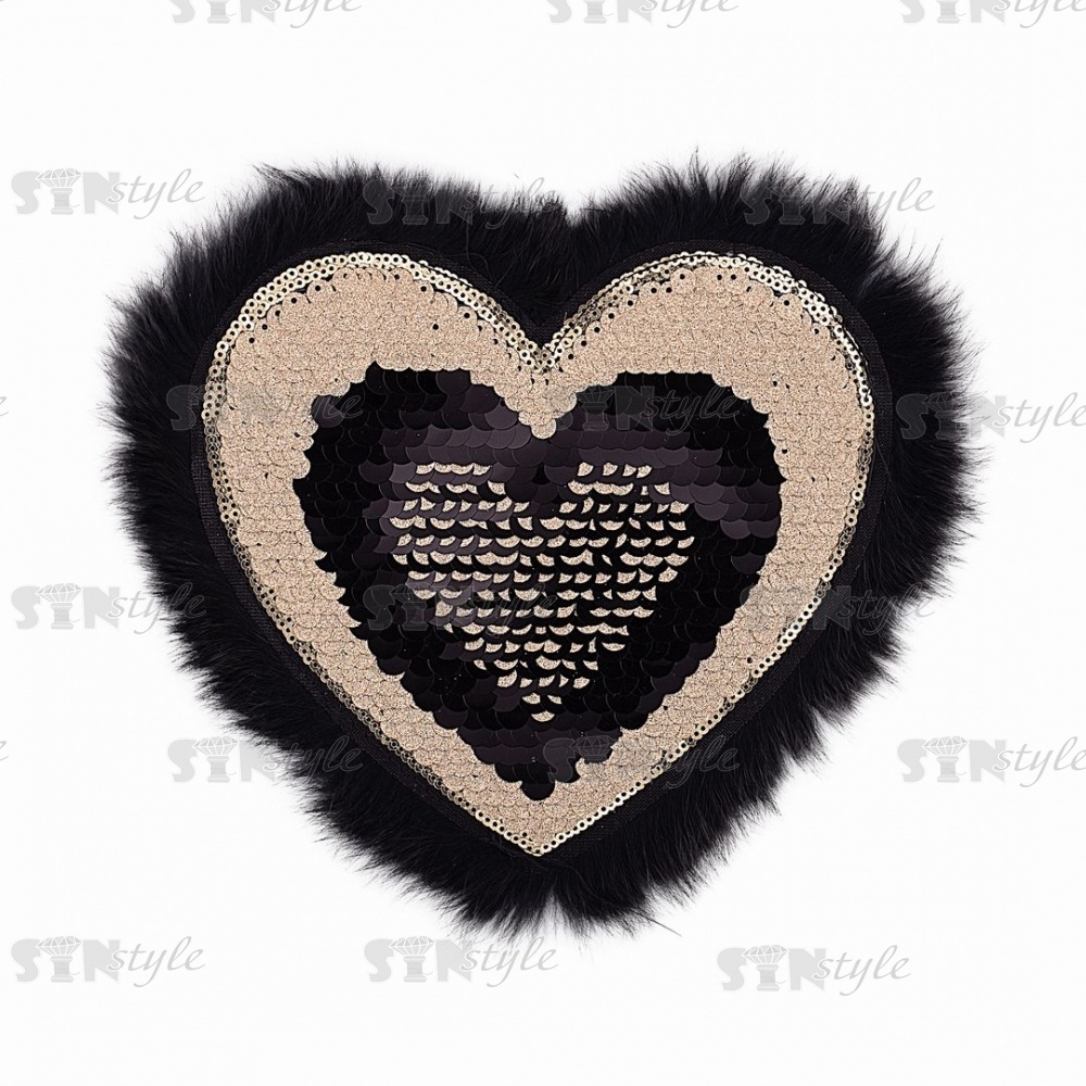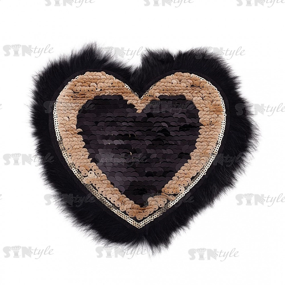 Аппликация на основе из сетки изготовлена из пайеток и натурального меха. Применяется для украшения детской одежды, головных уборов, сумок, рюкзаков, альбомов и открыток.