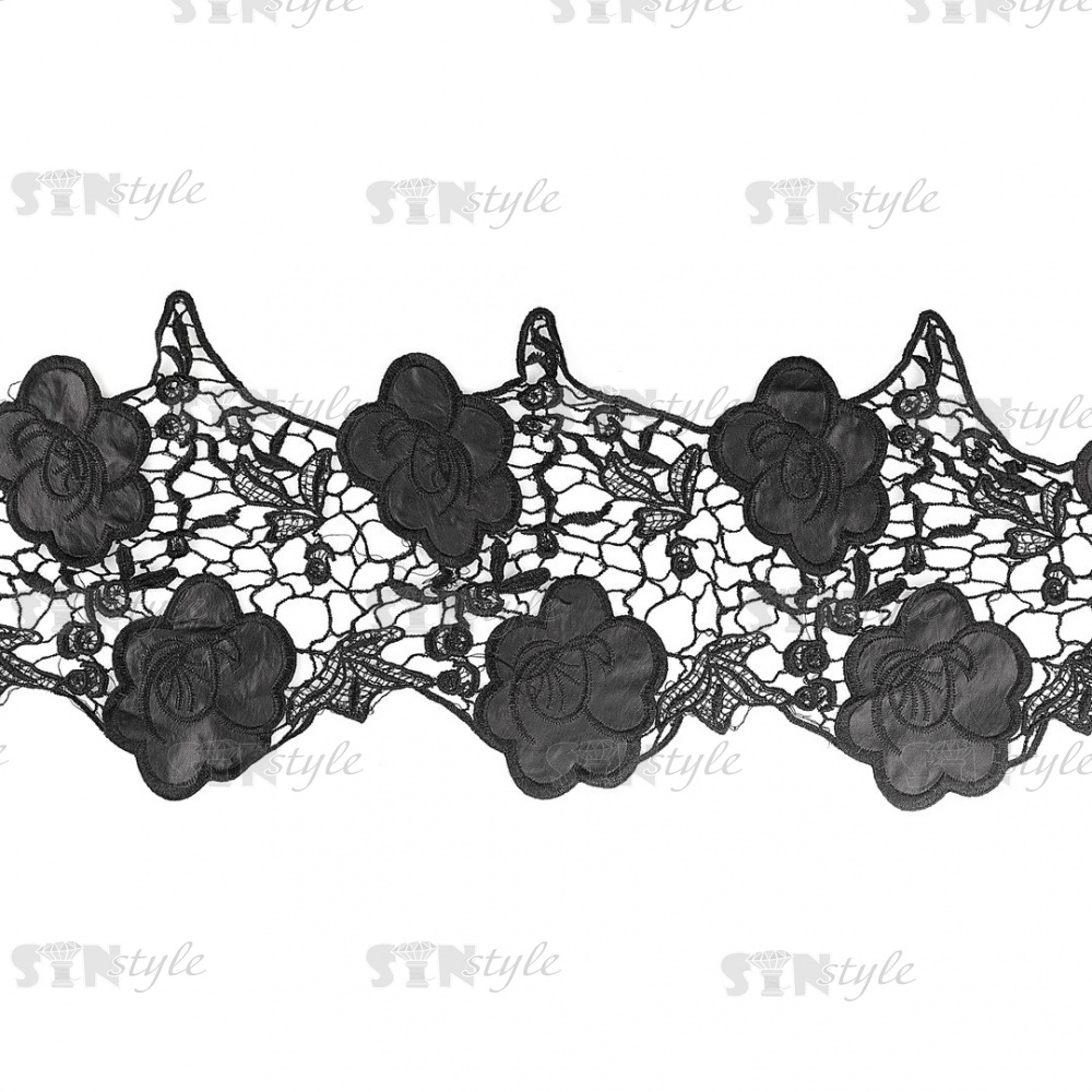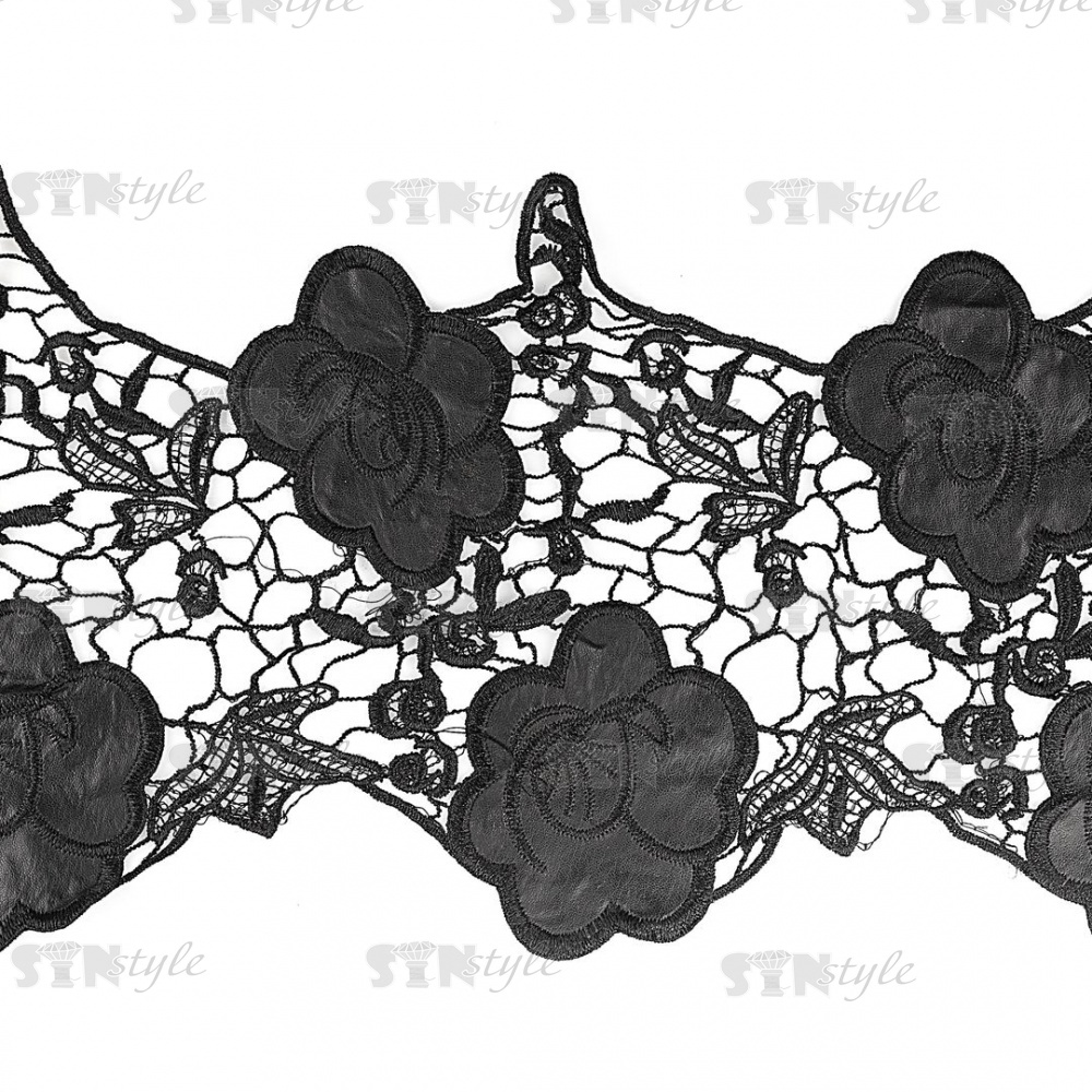 Кружево кожаное, на тонкой ажурной основе россыпь крупных цветов, ширина 105 мм, намотка 15 ярдов, цвет черный