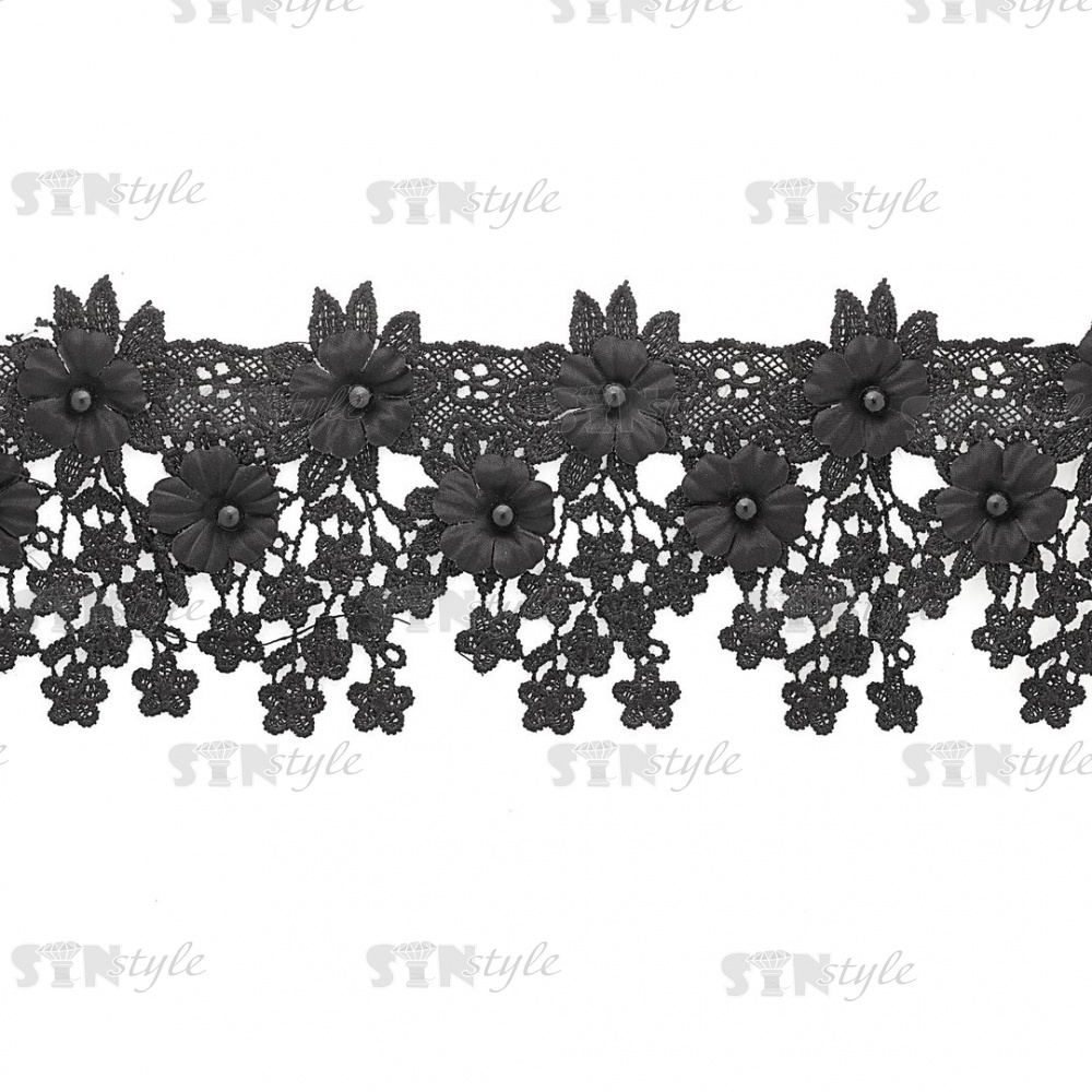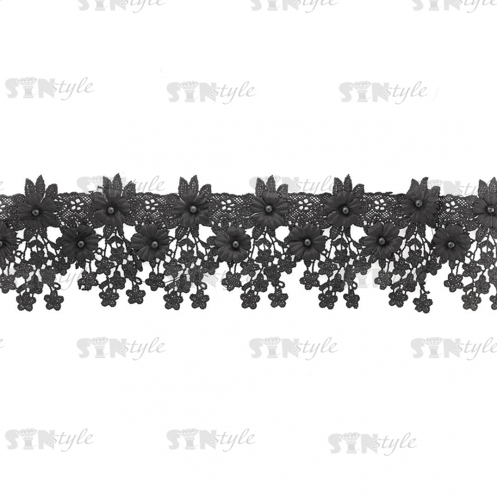 Кружево ажурное с отделкой бусинами и цветами, ширина 90 мм, цвет черный, намотка 10 ярдов