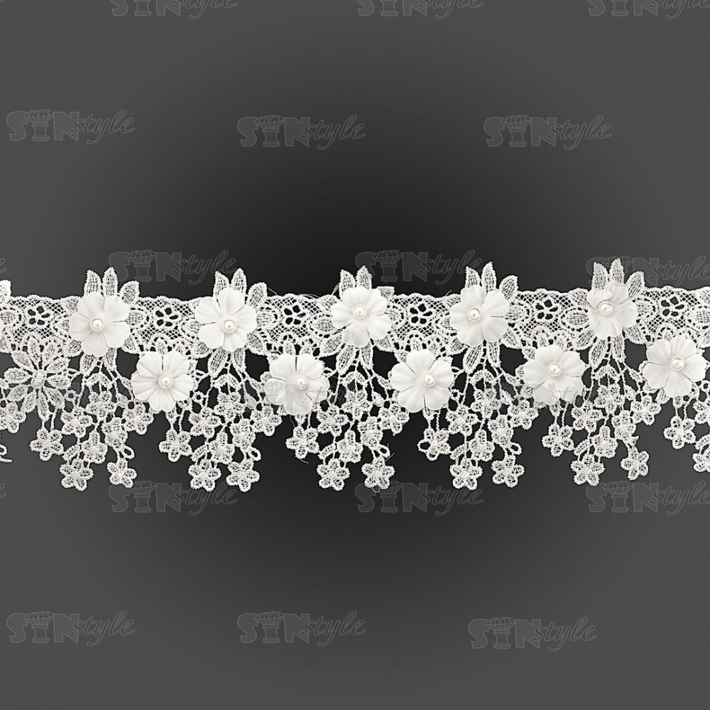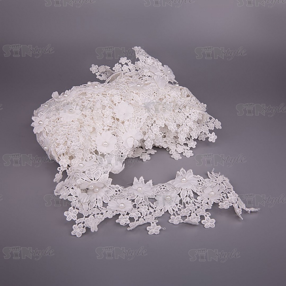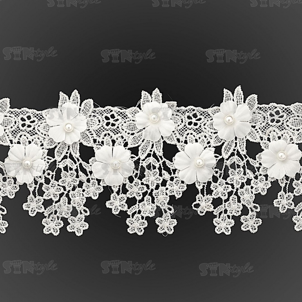 Кружево ажурное с отделкой бусинами и цветами, ширина 90 мм, цвет белый, намотка 10 ярдов