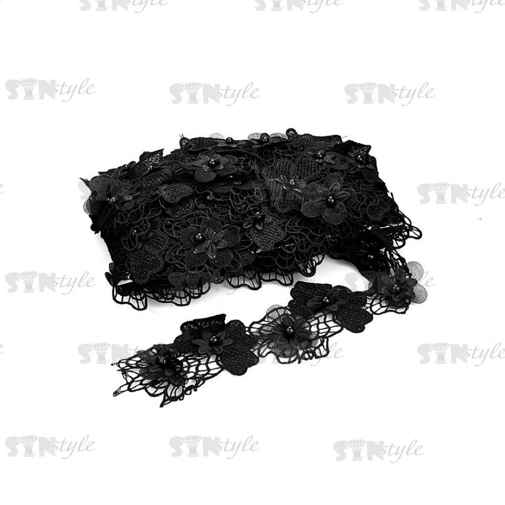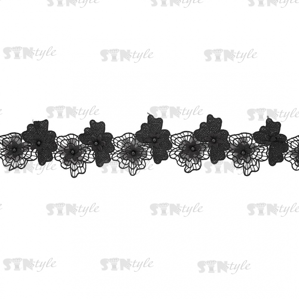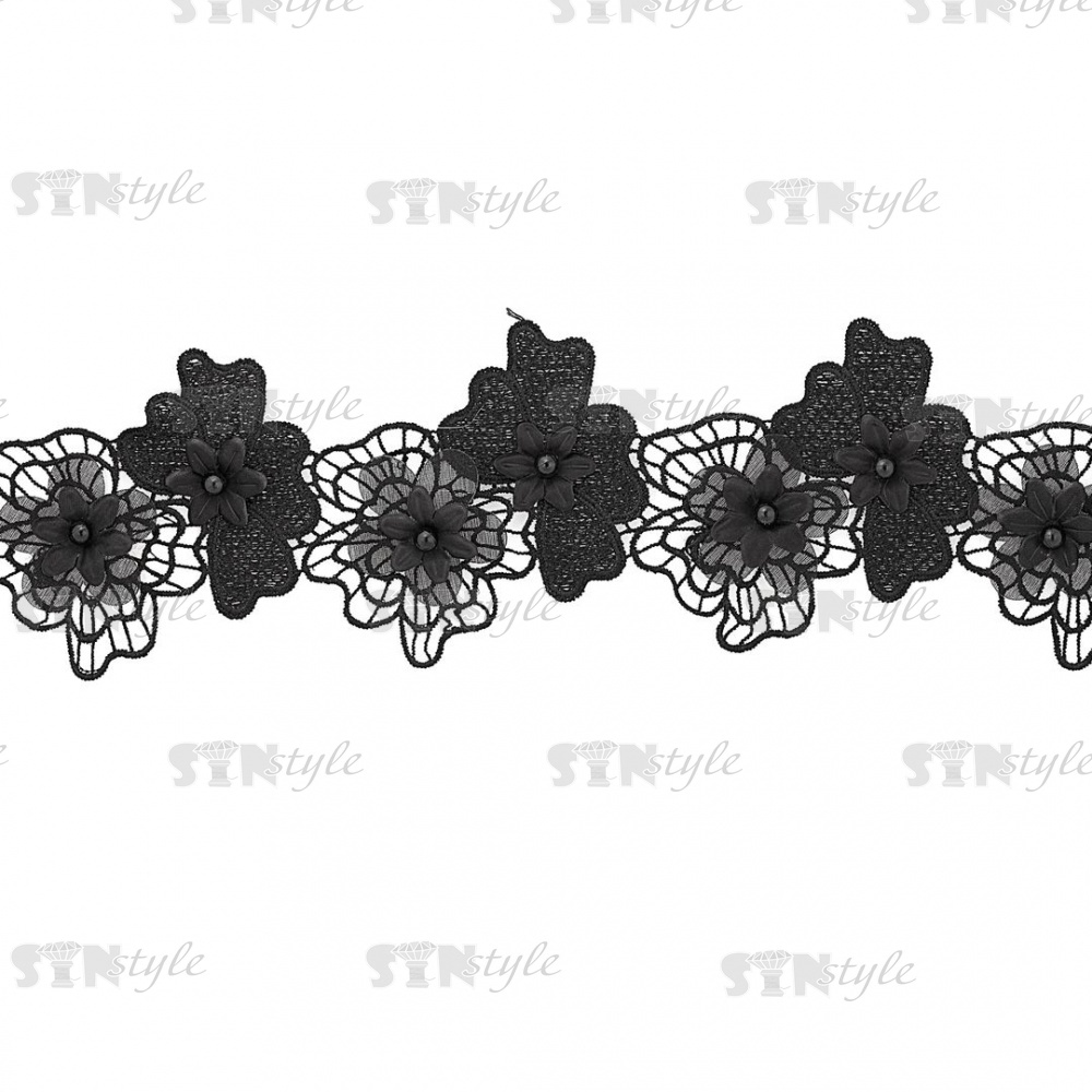 Кружево "Цветочное", нежная ассиметричная гирлянда из объемных цветов разных оттенков черного, ширина 80 мм, цвет черный, намотка 10 ярдов