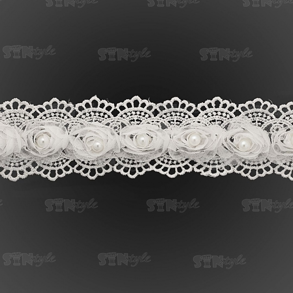 Кружево ажурное с отделкой из органзы и бусин, цвет белый, ширина 60 мм, намотка 10 ярдов