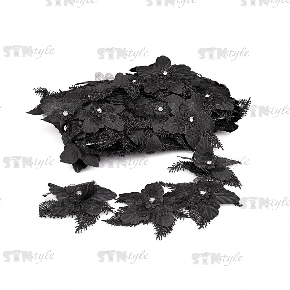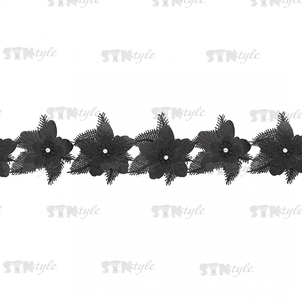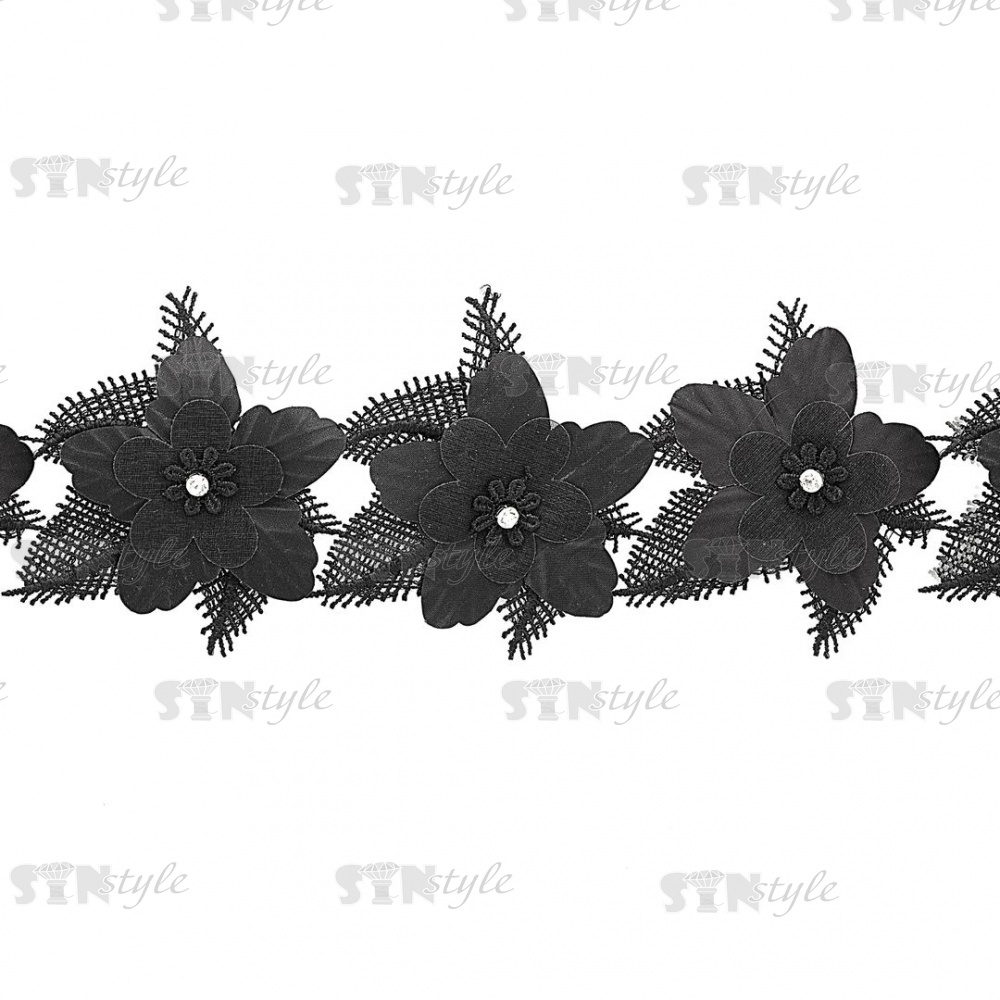 Кружево "Цветочное", нежная цветочная гирлянда из объемных цветов с белой стразой в середине цветка, ширина 80 мм, намотка 10 ярдов, цвет черный