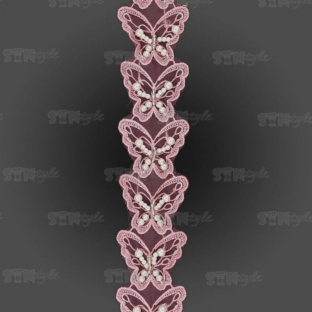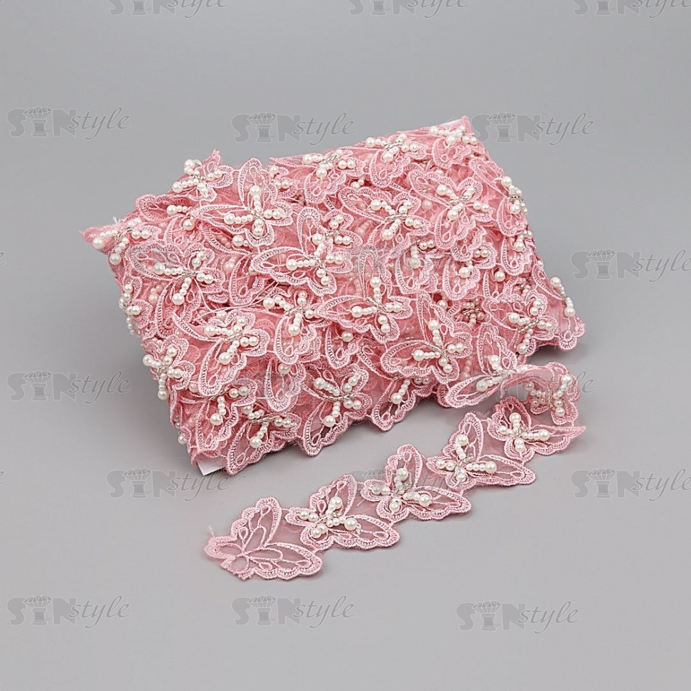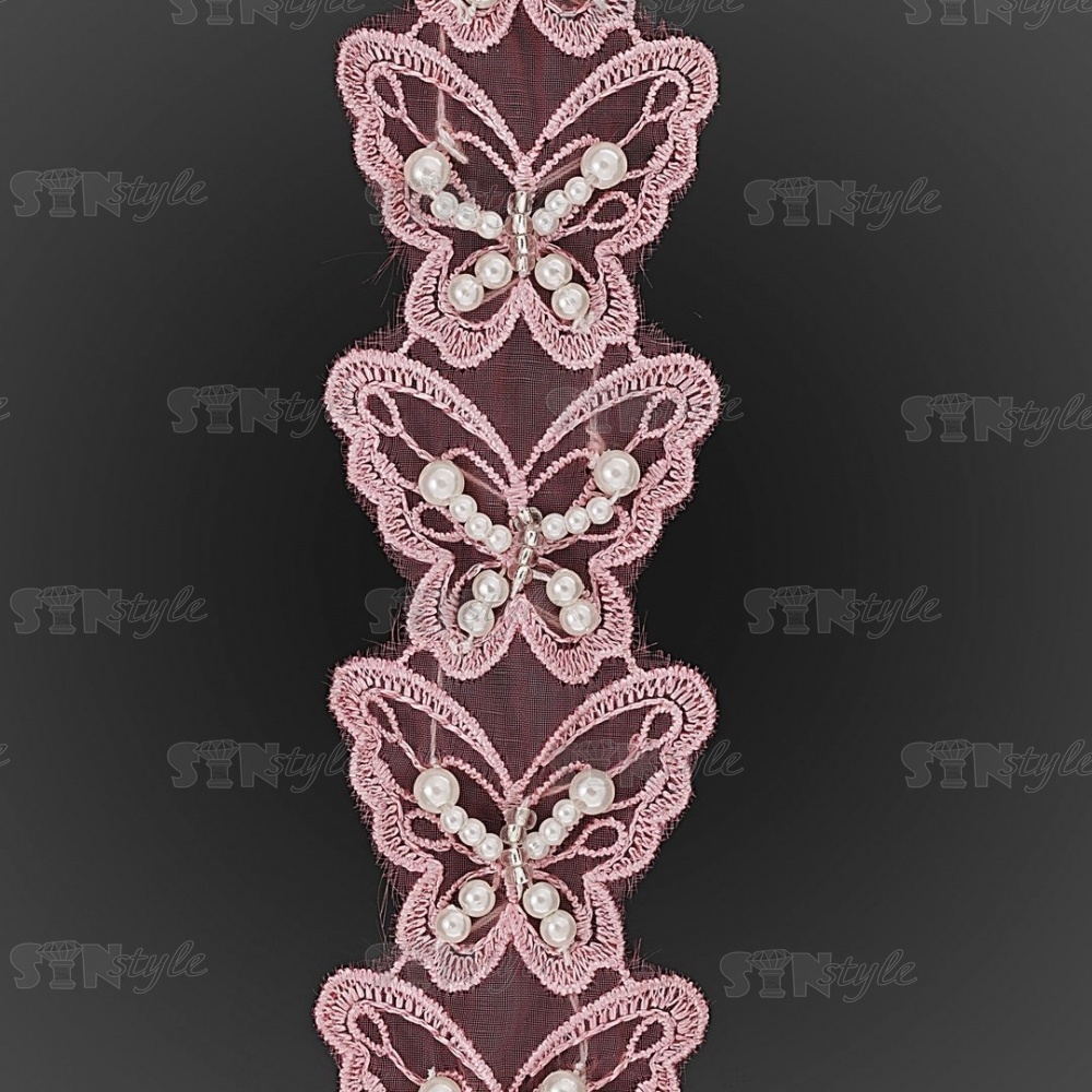 Кружево "Бабочки", гирлянда из нежных бабочек декорирована бусинами, ширина 45 мм, цвет розовый, намотка 10 ярдов