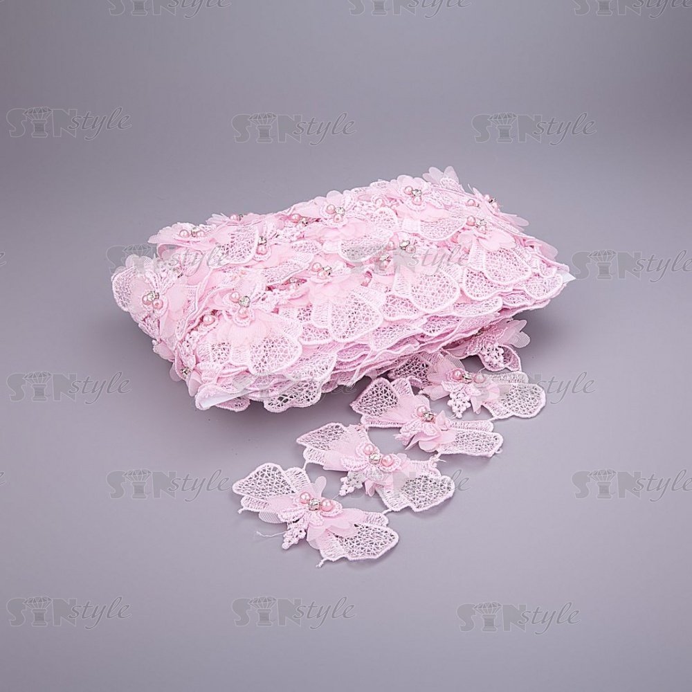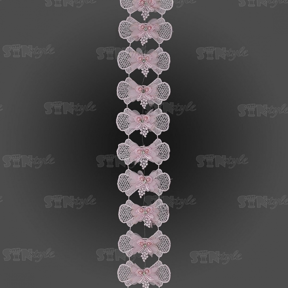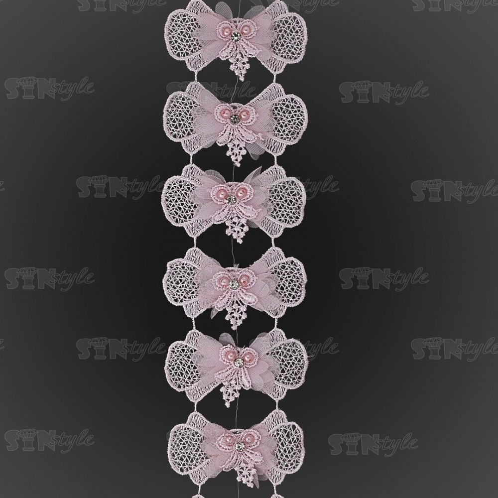 Нежное ажурное кружево из бантиков, декорированное белыми стразами и бусинами в цвет кружева, ширина 75 мм, цвет розовый, намотка 10 ярдов