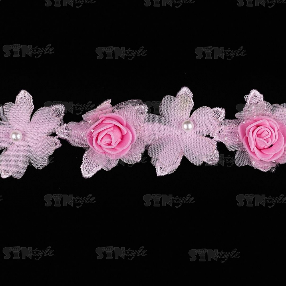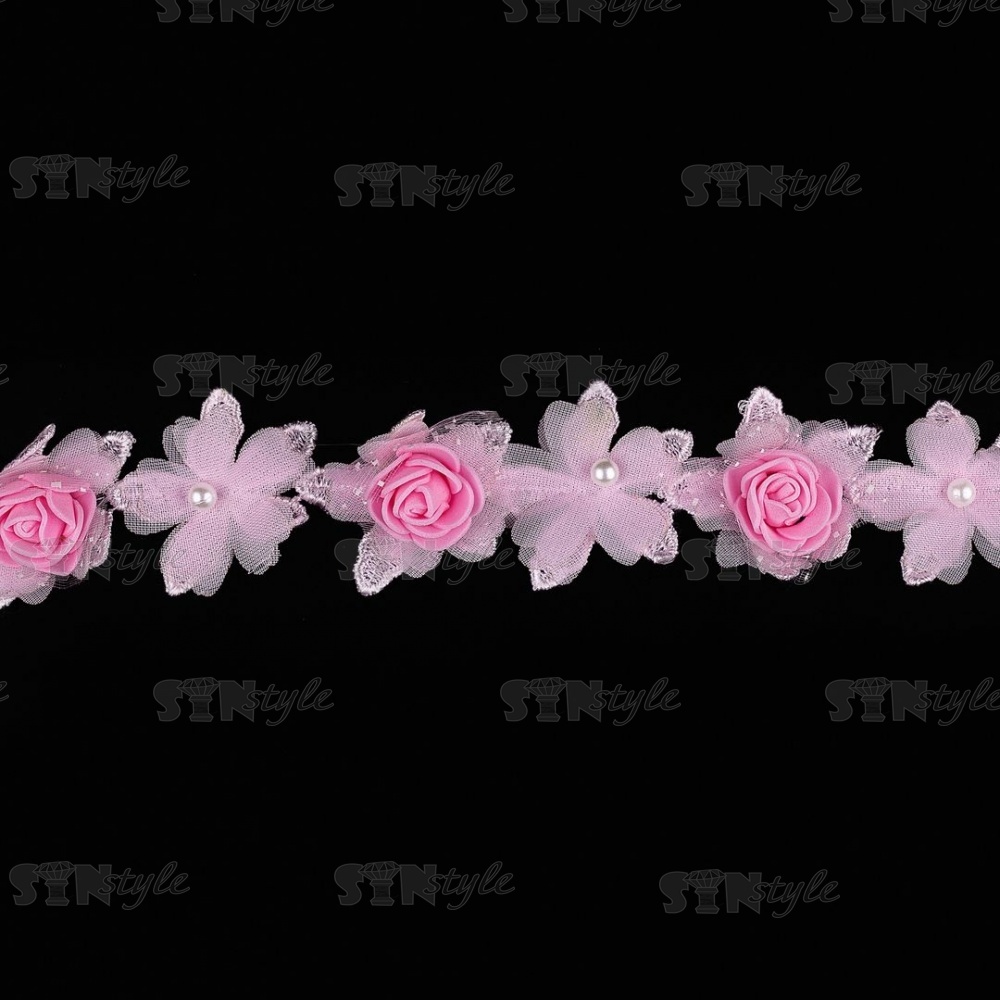 Кружево "Цветочное", нежная цветочная гиирлянда из объемных капроновых и фоамирановых цветов с бусиной в середине цветка, ширина 45 мм, цвет розовый, намотка 10 ярдов