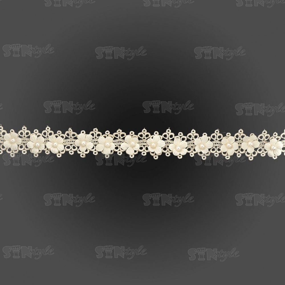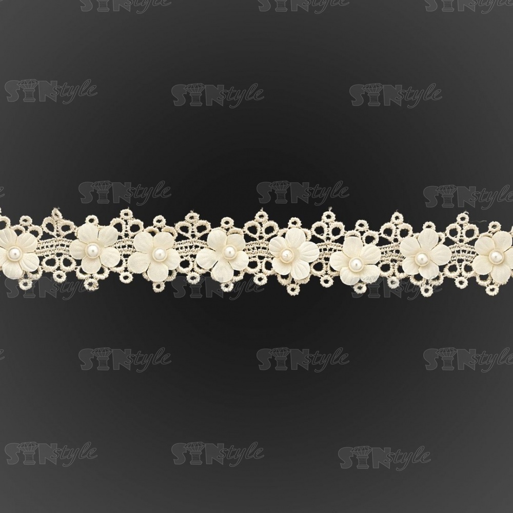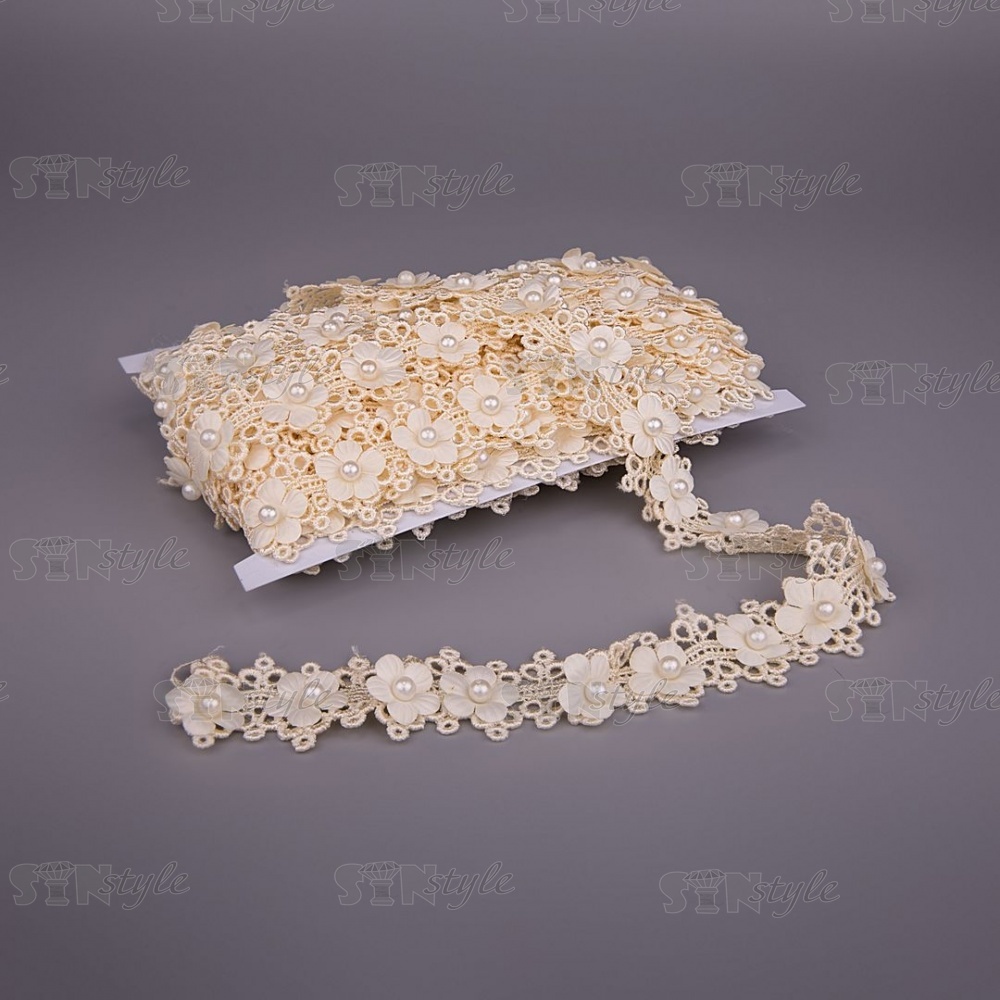 Кружево ажурное с цветами и бусинами, ширина 30 мм, намотка 10 ярдов, цвет шампань