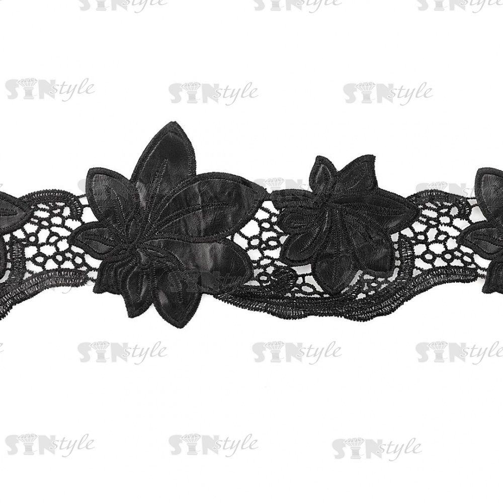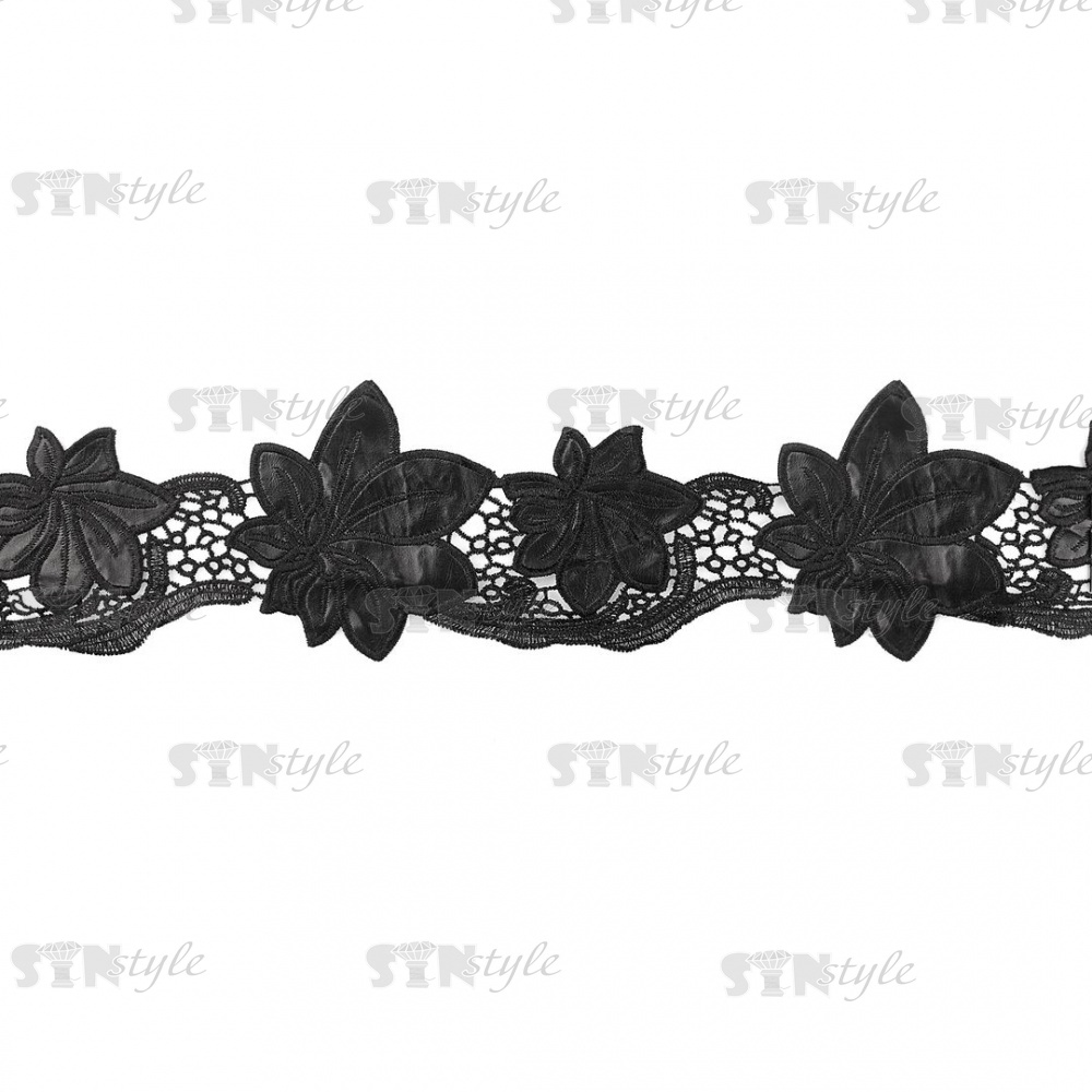 Кружево кожаное, на тонкой ажурной основе россыпь крупных цветов из кожи, ширина 120 мм, намотка 10 ярдов, цвет черный