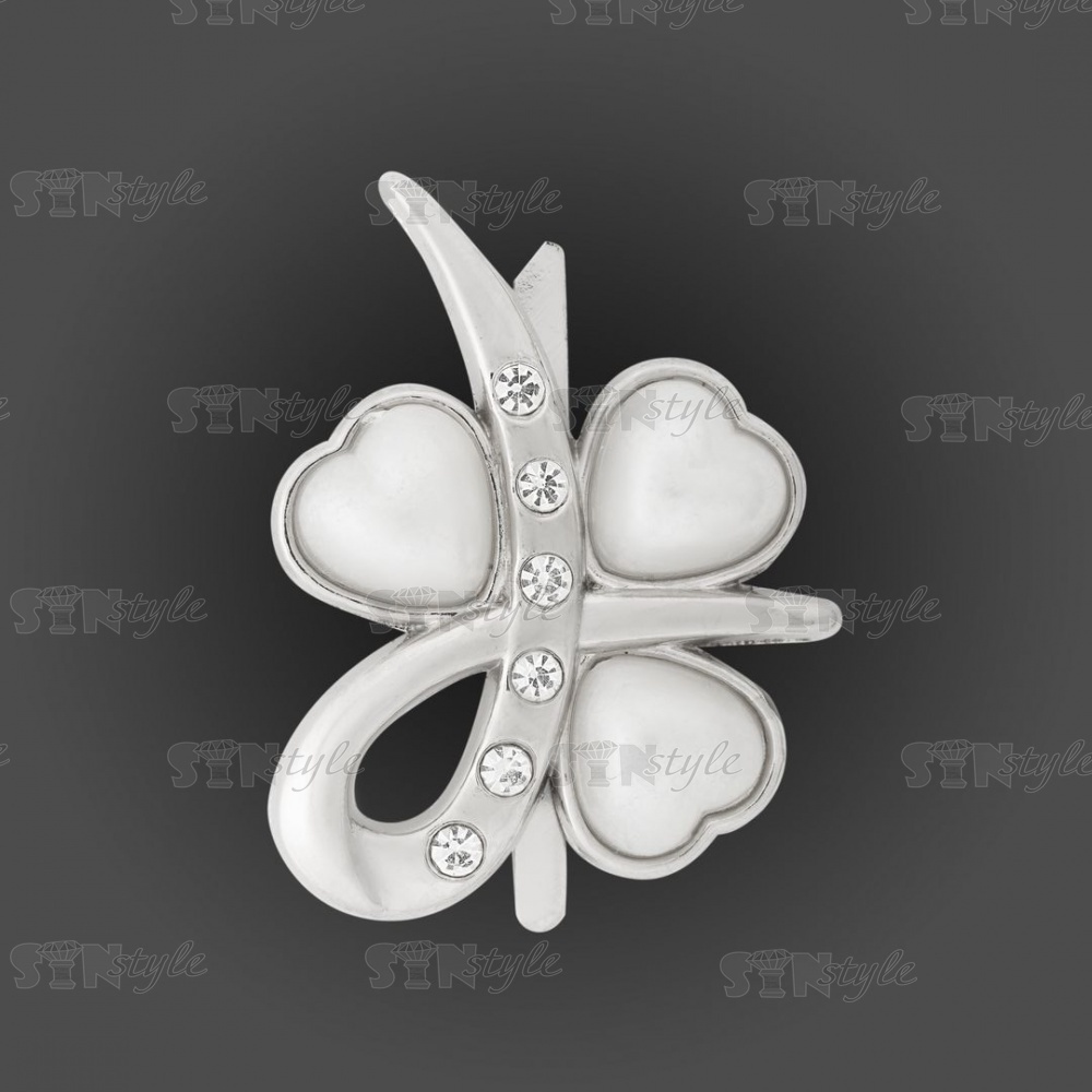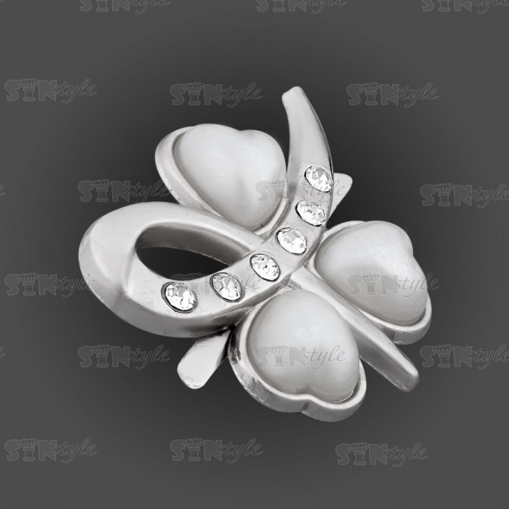 Брошь металлическая со стразами, крепление усики, цвет серебро+белые стразы и бусины, размер 37 мм х 31 мм