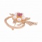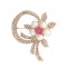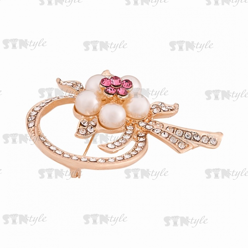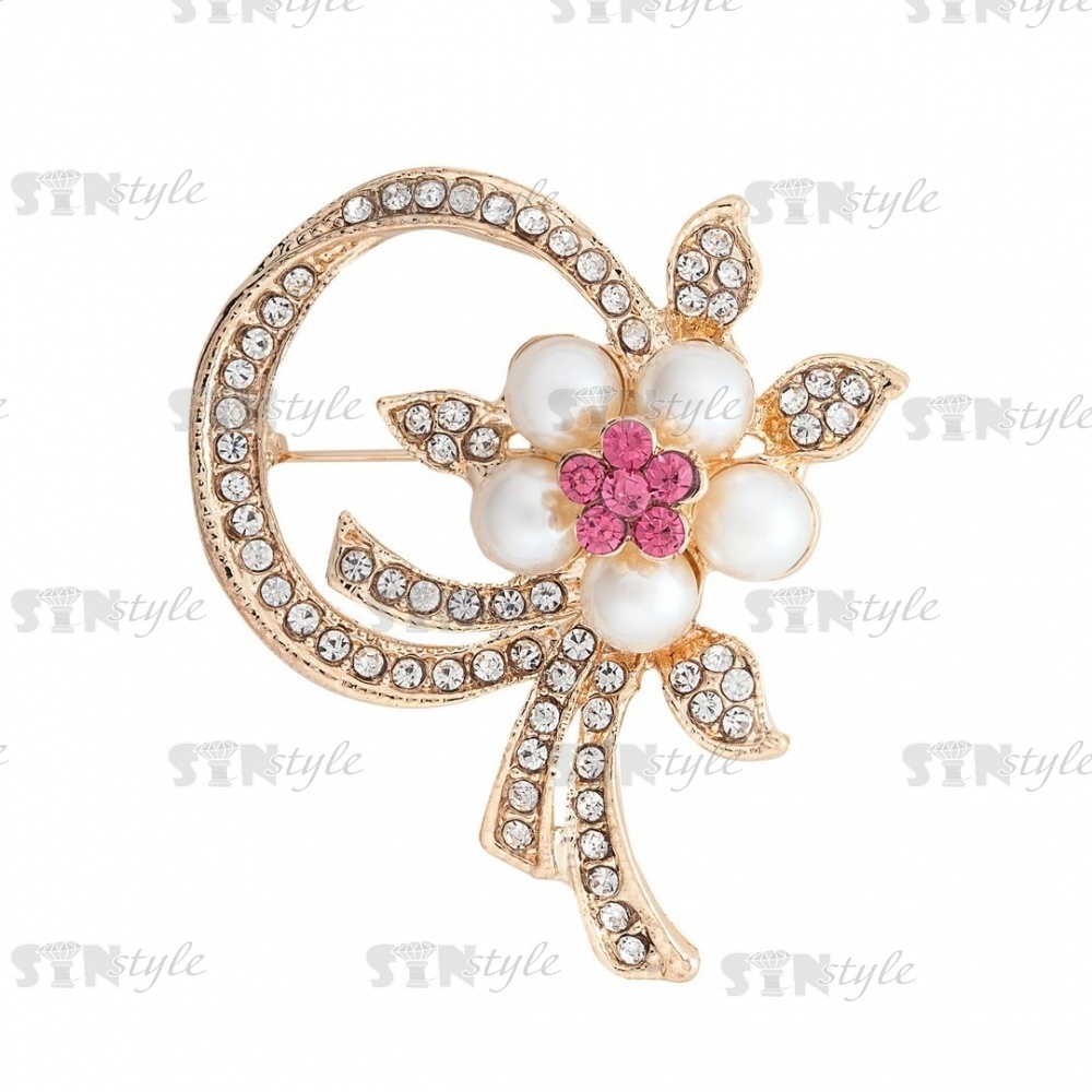 Брошь металлическая со стразами, застежка булавка, цвет золото+белые/розовые стразы, белые бусины, размер 48х56 мм