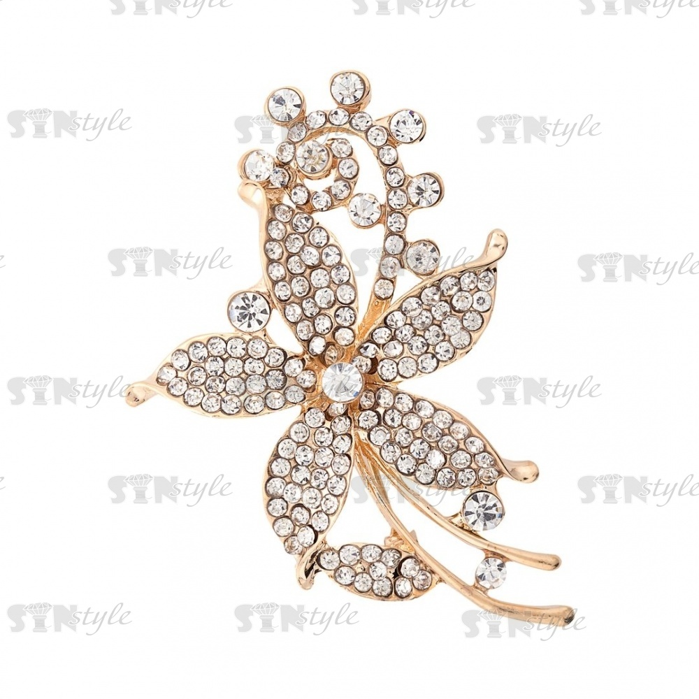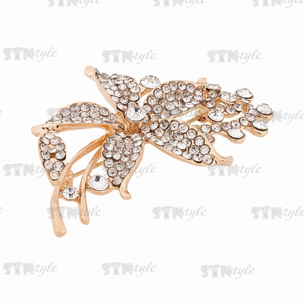 Брошь металлическая со стразами, застежка булавка, цвет золото+белые стразы,размер 40х58 мм
