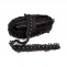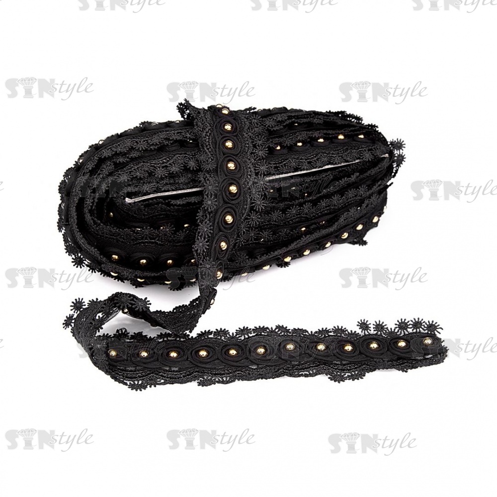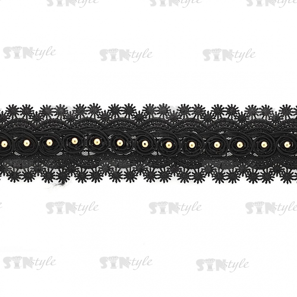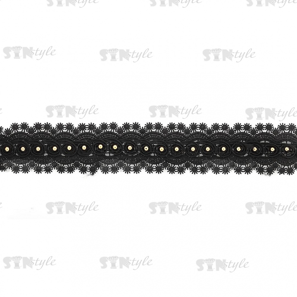 Кружево ажурное, дополненное скрученной капроновой лентой и золотыми бусинами, ширина 55 мм, намотка 15 ярдов, цвет черный