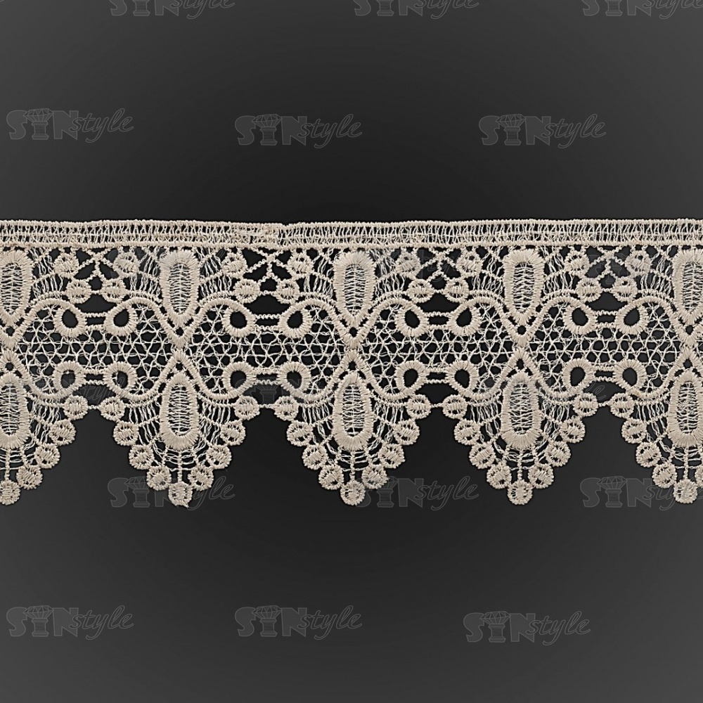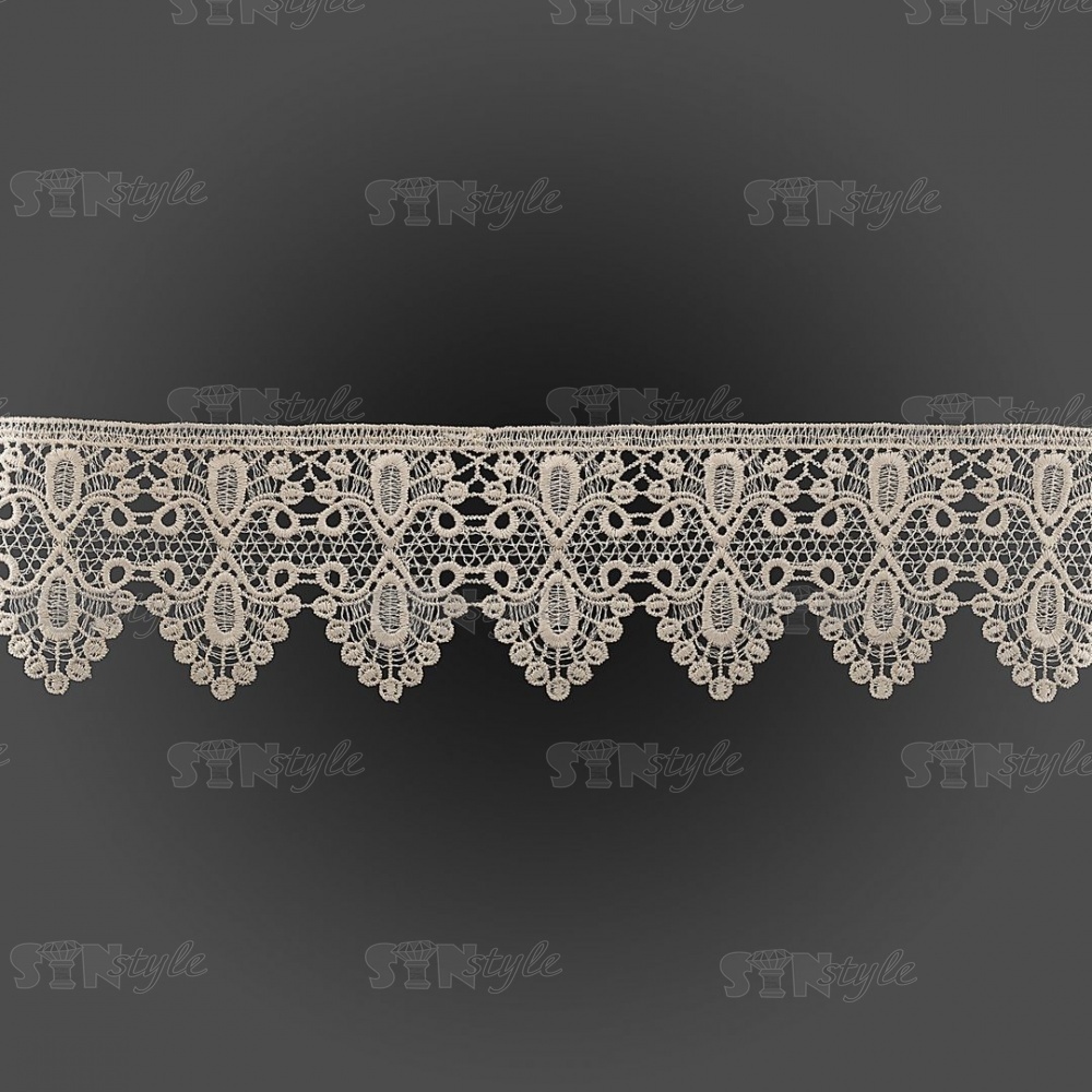 Кружево ажурное с нежным причудливым узором и фестонами по краю, ширина 80 мм, цвет лен, намотка 15 ярдов