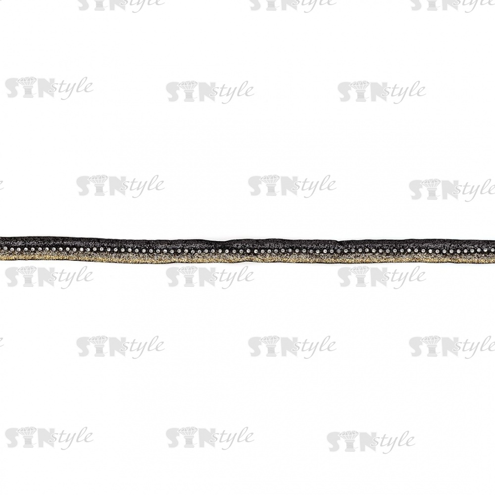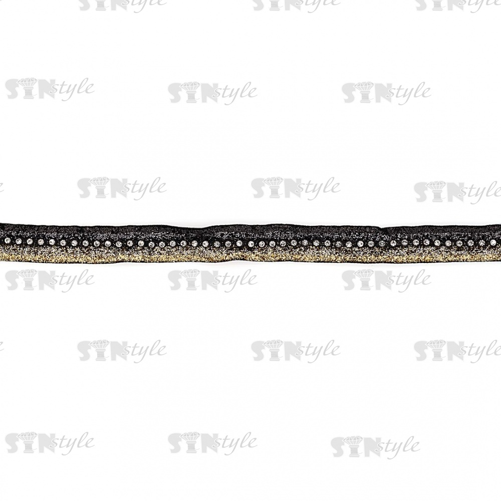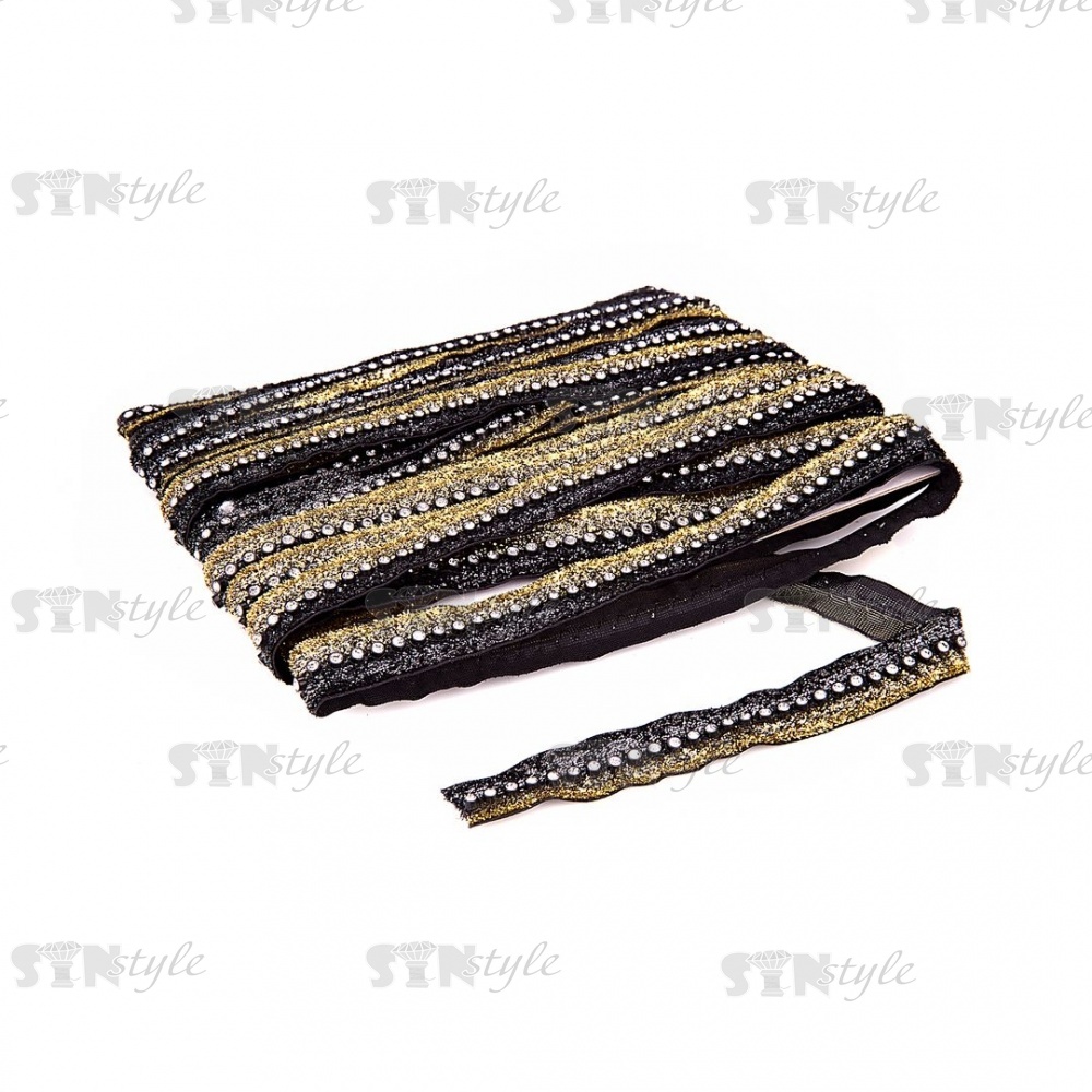 Декоративная бархатная лента со стразами, цвет черный+золото+серебро, ширина 18 мм, намотка 15 ярдов