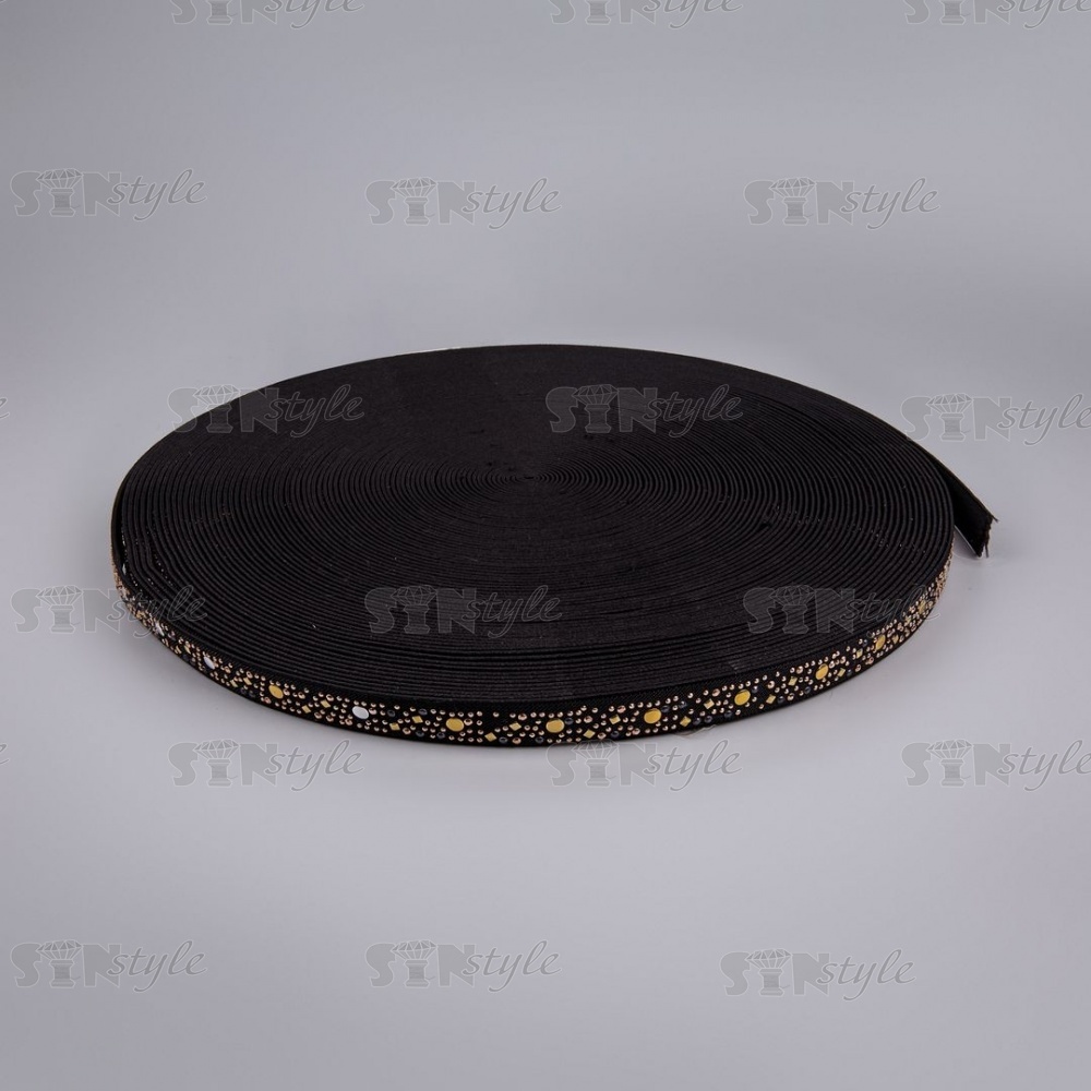 Оригинальная декоративная резинка украшена золотистыми элементами. Будет шикарно смотреться на ткани любого цвета, придаст яркой индивидуальности вам и вашему изделию. Подойдет для оформления верха юбки или брюк, низа рукавов и куртки, используется в декорировании аксессуаров и многого другого.
