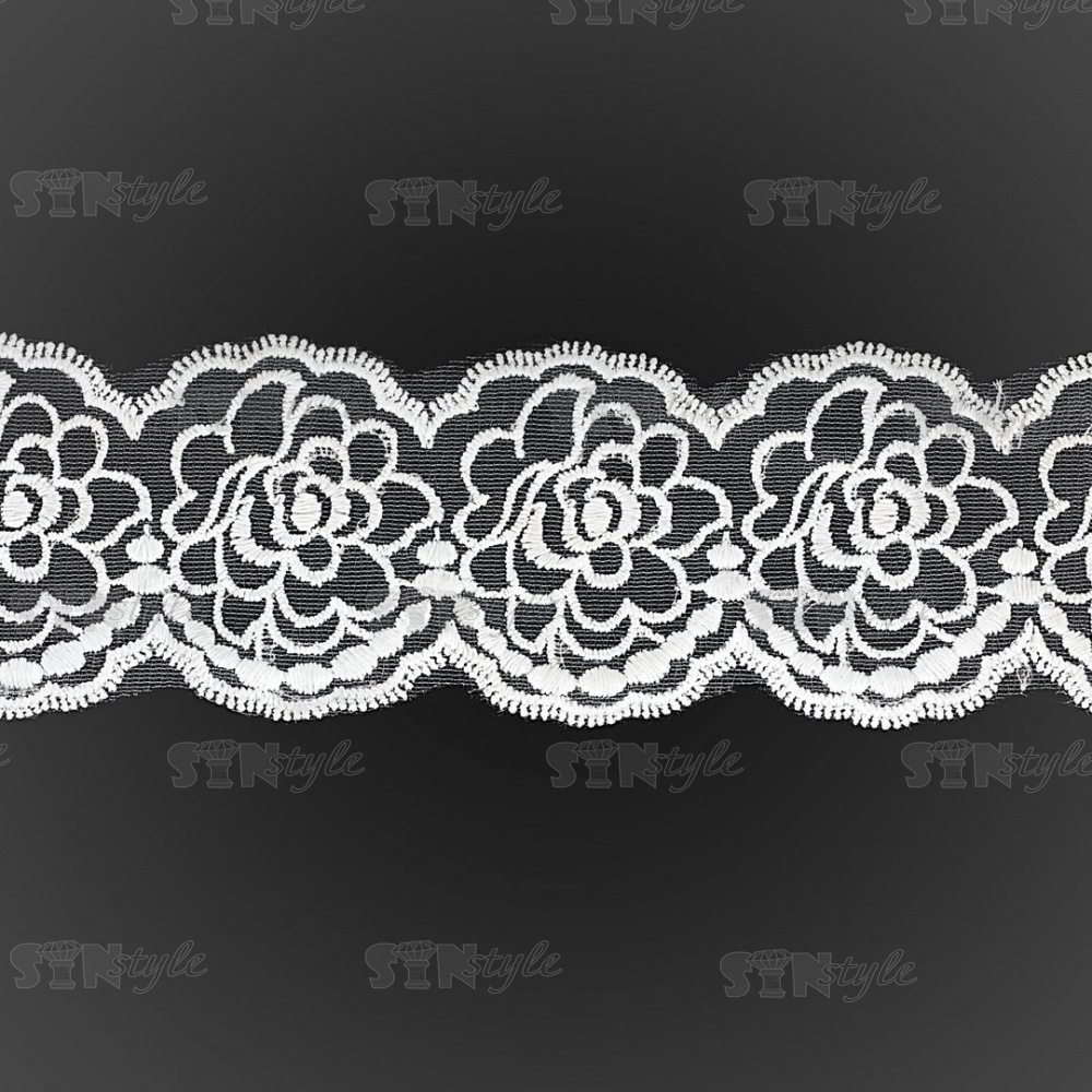 Кружево на сетке белого цвета с белой вышивкой, ширина 75 мм, намотка 15 ярдов