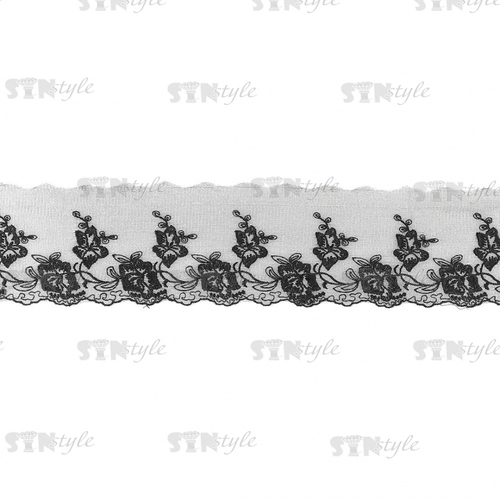 Нежное воздушное кружево на сетке с цветочными мотивами и фигурным краем, цвет черный, ширина 80 мм, намотка 15 ярдов