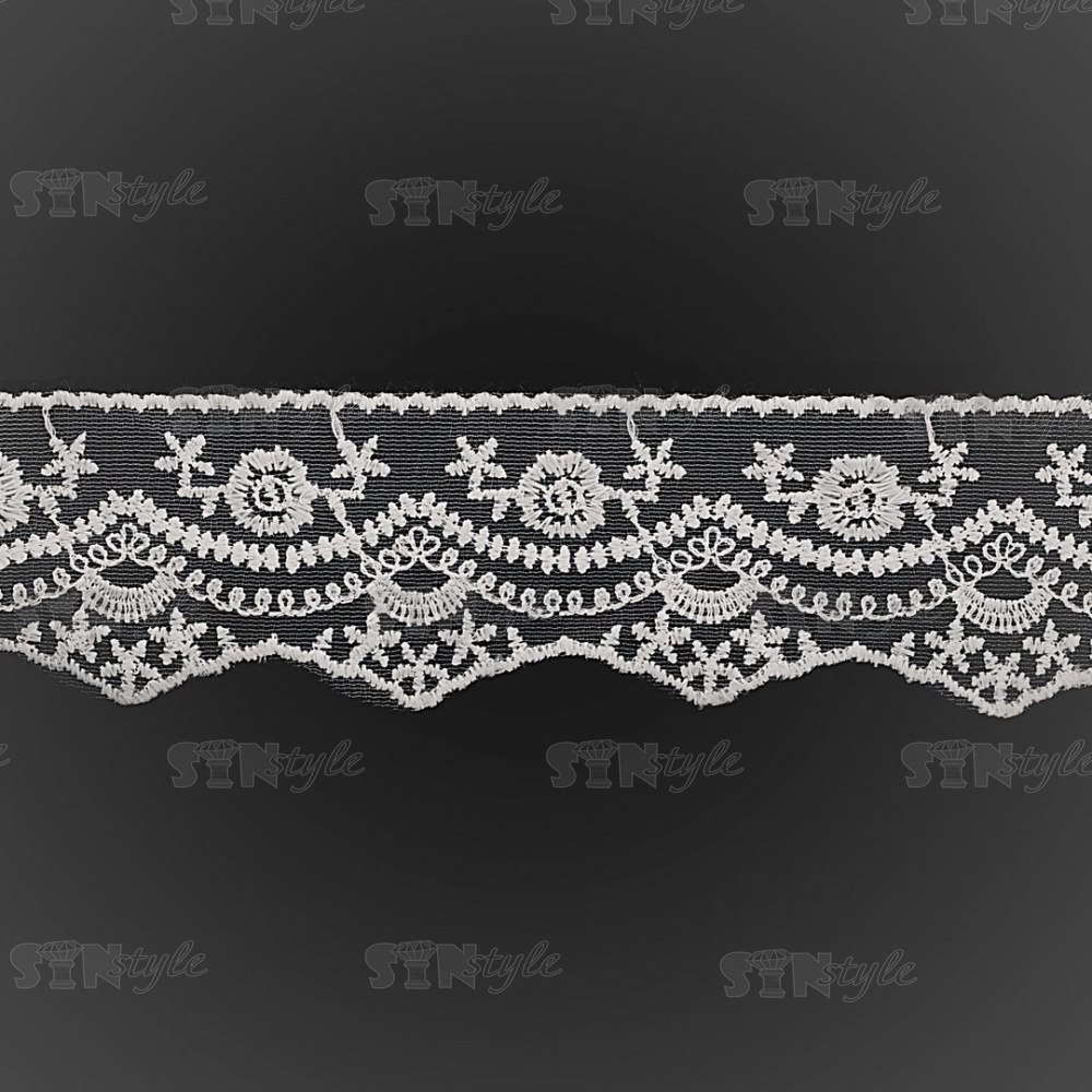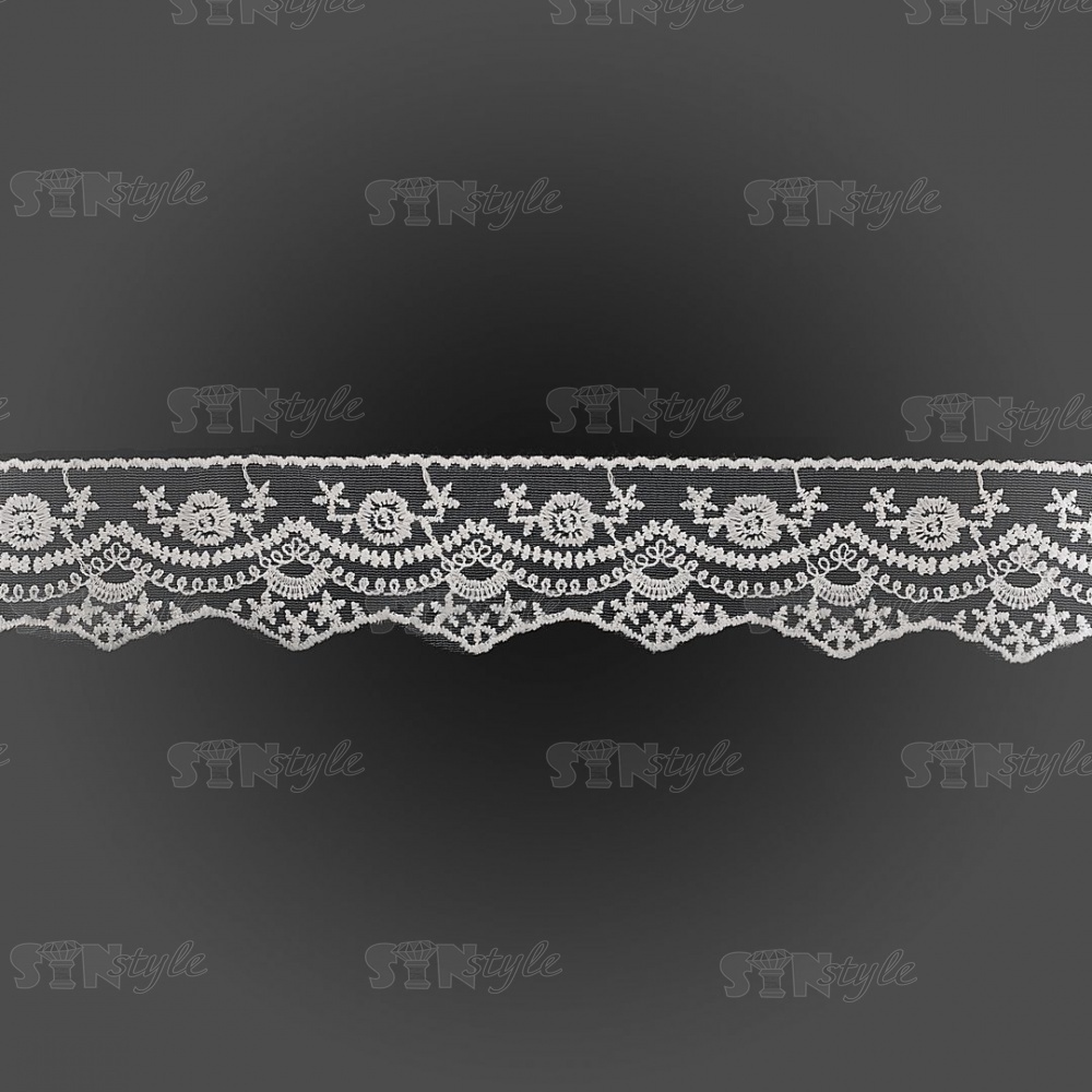 Кружево на сетке белого цвета с белой вышивкой, ширина 60 мм, намотка 15 ярдов
