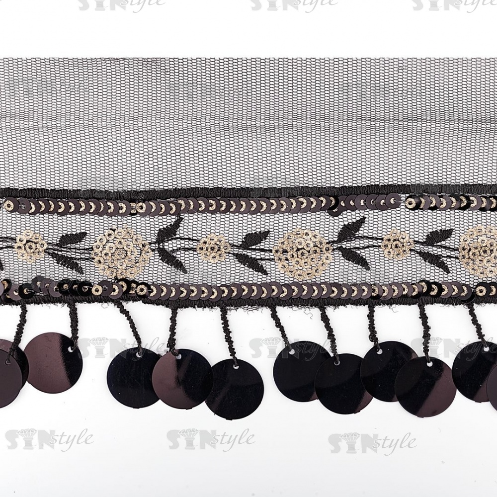 Декоративная тесьма на сетке с пайетками, цвет черный, ширина участка из пайеток 70 мм, намотка 16 ярдов