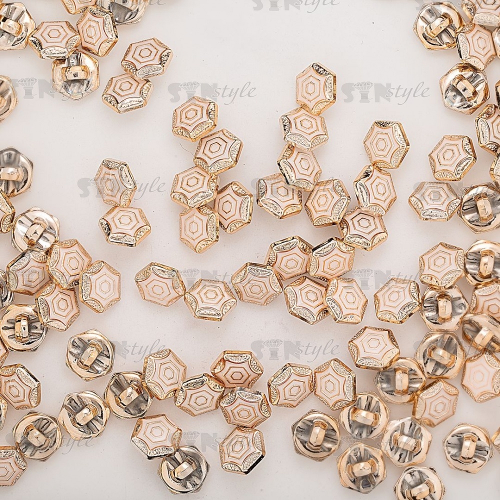 Пуговица пластиковая на ножке, 20L, в форме шестигранника, золотая основа с белой эмалью