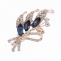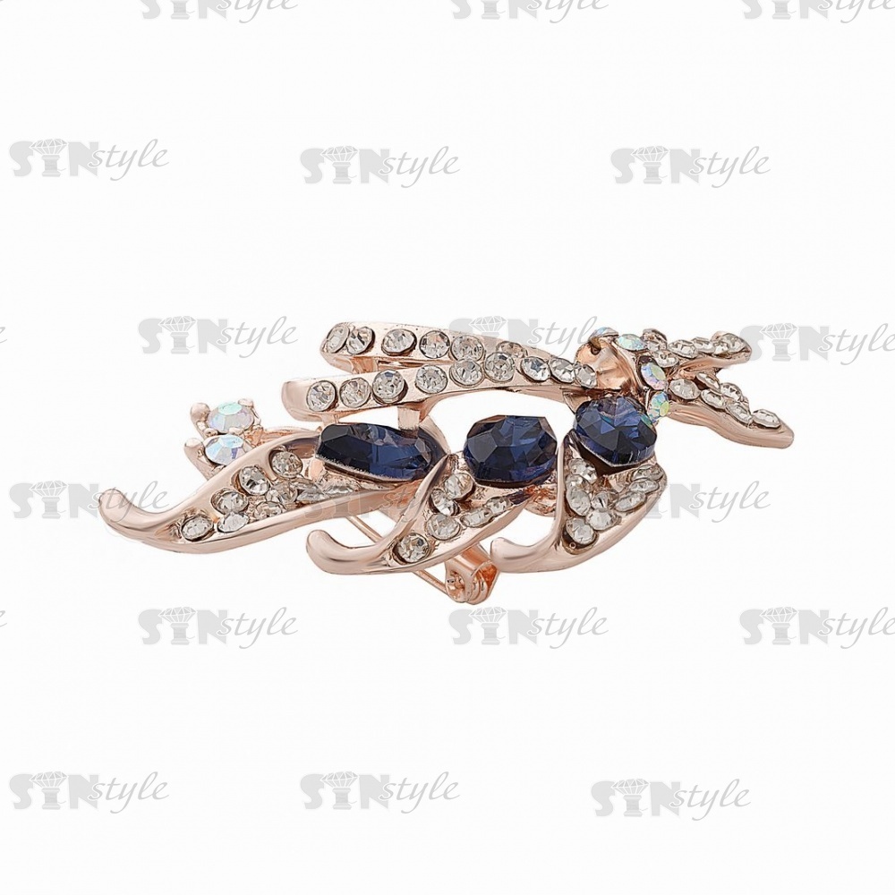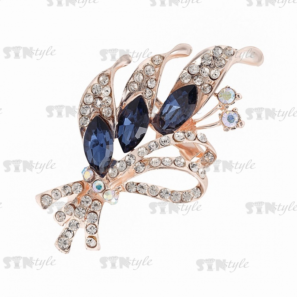 Брошь металлическая со стразами, застежка булавка, цвет золото+белые и синие стразы, размер 32х57 мм